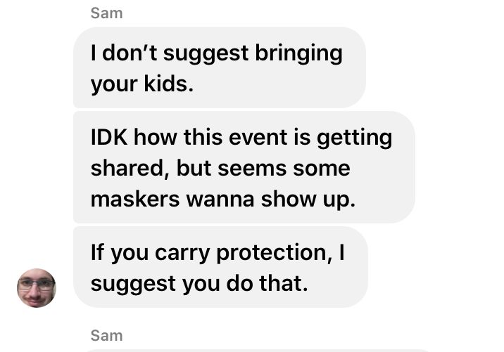 The followers who clicked “Going” received private messages from Walker in a Facebook Messenger group. The Dallas Observer was able to obtain screenshots of the conversation leading up to and during the protest.