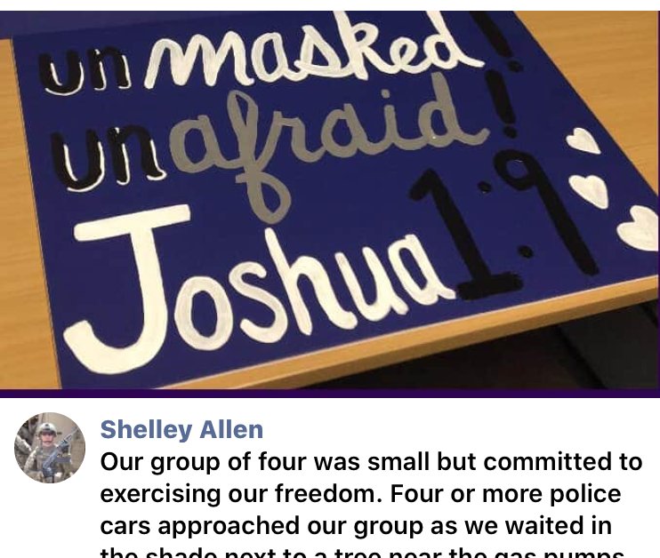 There didn’t seem to be enough people to form groups to storm various store chains with their exposed faces. Only four people made it to the meetup point, a patch of shaded grass near the Kroger location’s gas station. One of the protesters, identified on her Facebook page as Shelley Allen, showed up with a blue, white and silver protest sign that read “Unmasked! Unafraid! Joshua 1:9,” with little hearts next to the Bible reference.