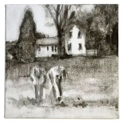 Every piece of art has a backstory, but Lucy Kirkman Allen’s is one for the books. She and her husband bought an 1800s farmhouse in rural Virginia from a man named James. Not long after they moved in, James showed the couple his most prized photograph. In it, three women are standing in front of the farmhouse. Two are holding cats and the third is holding a handwritten placard with a message: We are here in the past, come visit in your time machine. James had a whole album of black and white photographs, mostly of women and young children, and agreed to loan it to Allen. When a Man’s House Is Finished is a collection of acrylic and oil painted replicas of photos from the album.