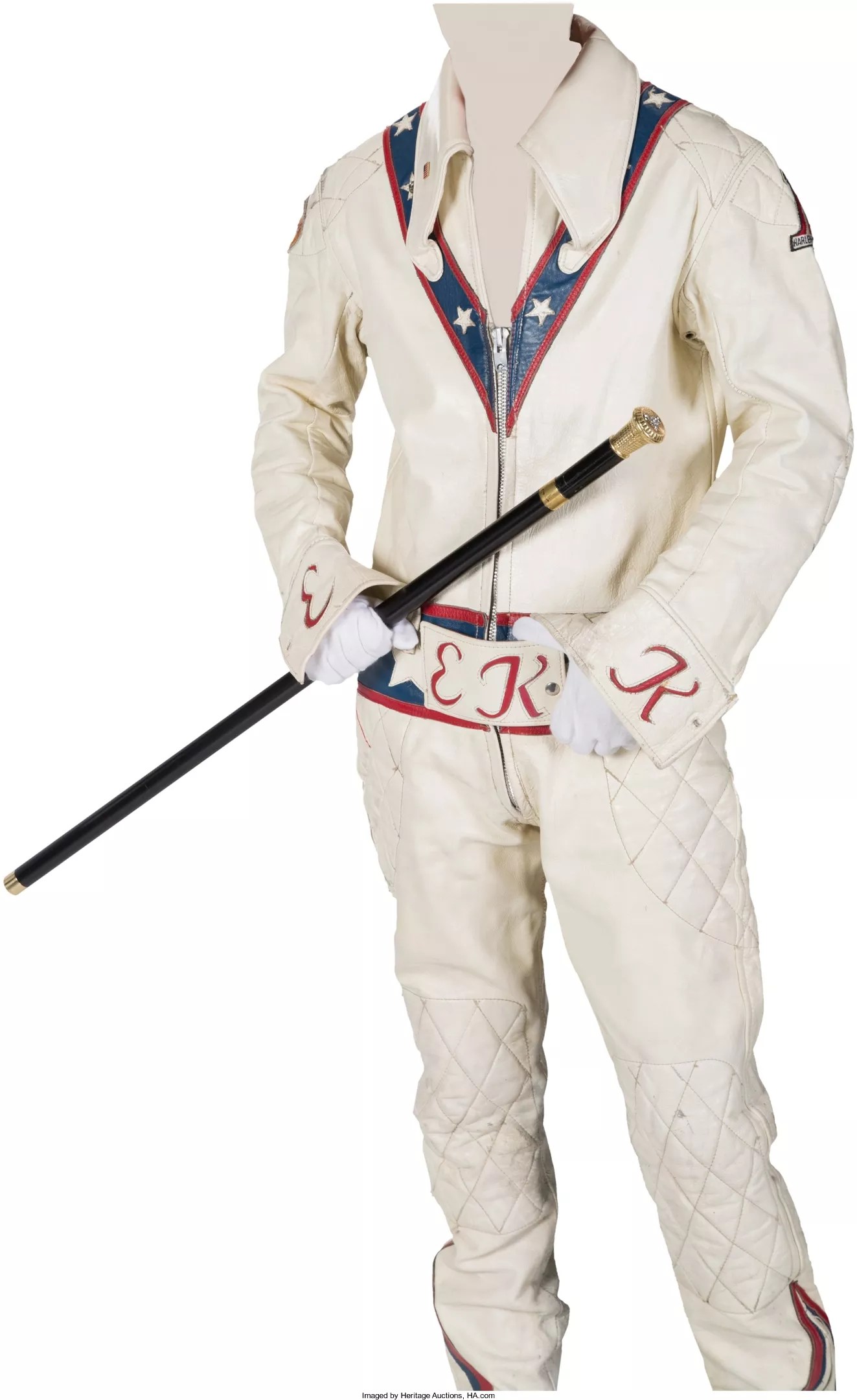 Knievel’s iconic white getup was worn during multiple performances in 1972 and 1973. This item is one of many in Heritage Auctions’ Platinum Night Sports Auction, closing Feb. 26. “It’s probably the most famous jumpsuit from the ’70s,” says Chris Ivy, Heritage Auctions director of sport collectibles. “Probably even more so than Elvis’ jumpsuit with the stars and the red, white and blue. Knievel was a trailblazer in that realm of daredevil. Similar to Babe Ruth in baseball, he was larger than life. These leathers were both utilitarian and a little bit of his calling card. There is certainly evidence of hitting the pavement a few times on these