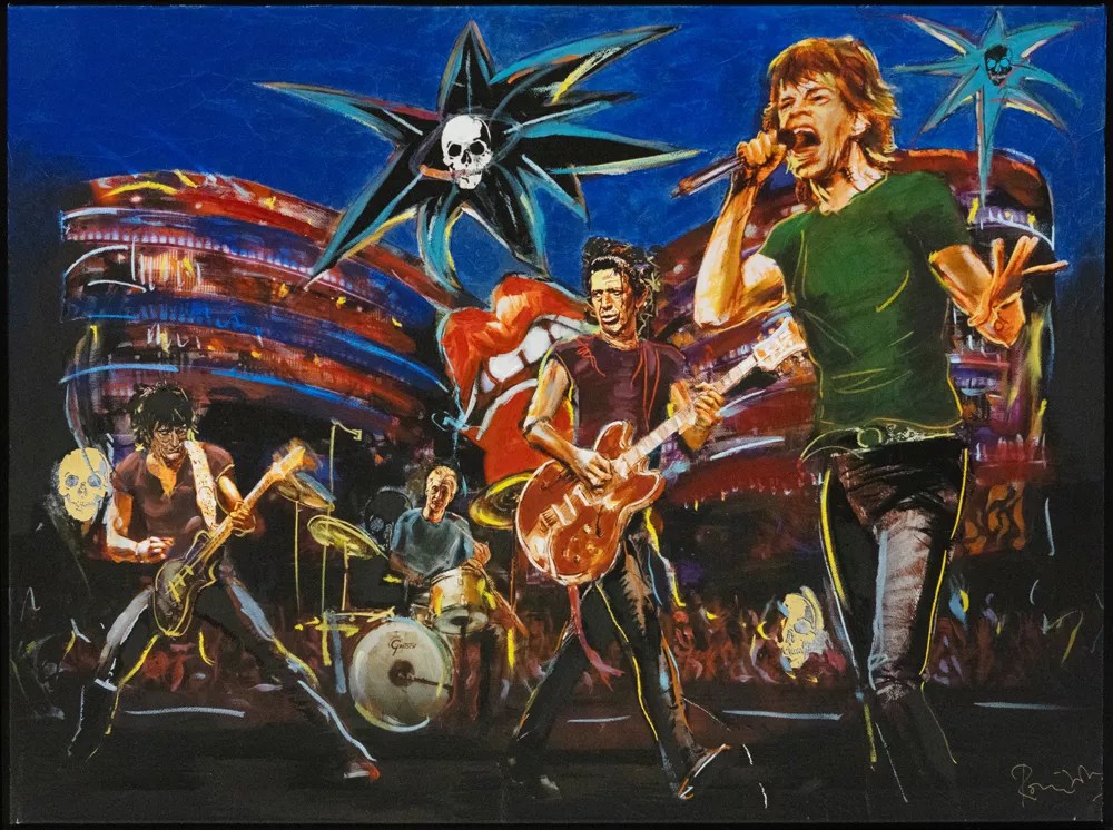 “Skulls on Stage” is a mixed-media work that captures the Rolling Stones during their Bigger Bang tour from 2005 to 2007. Wood created the painting in 2007; his signature can be found in the bottom right corner.