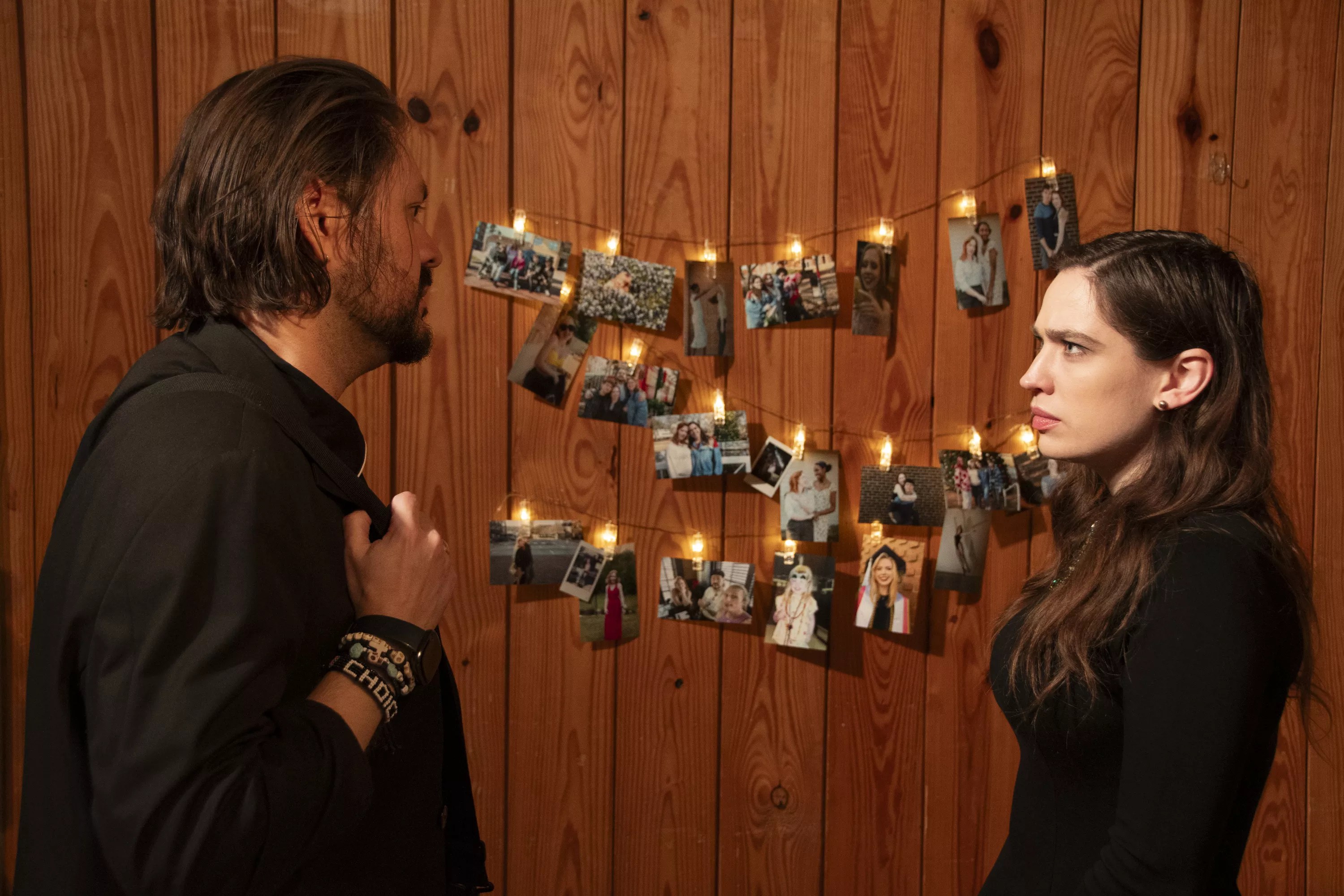 Andy Gonzalez-Bendiksen as Santiago Angel and Stephanie Oustalet as Eva Evergreen sharing a conversation.