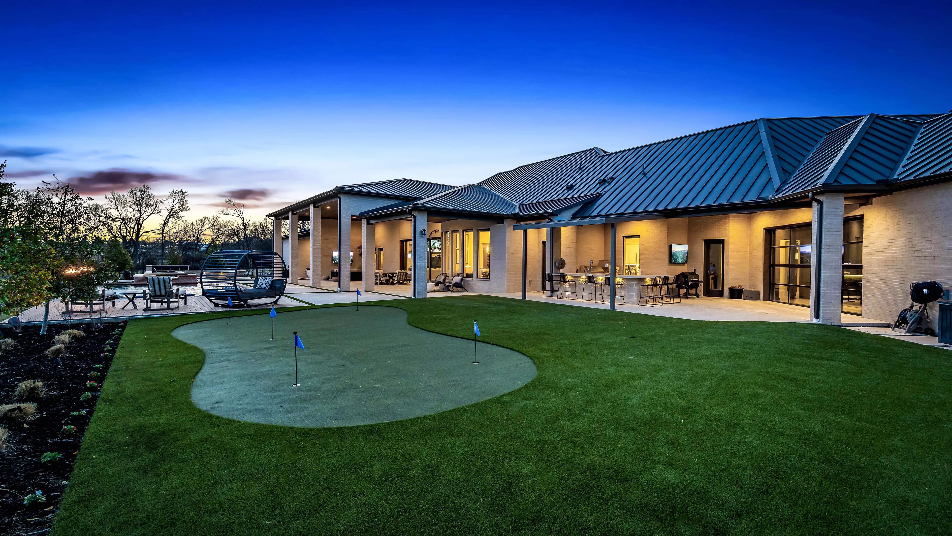 A small putting green is the centerpiece of a fantastic backyard party. It flanks a nice seating area and an outdoor kitchen with a grill, pizza oven and beer tap.