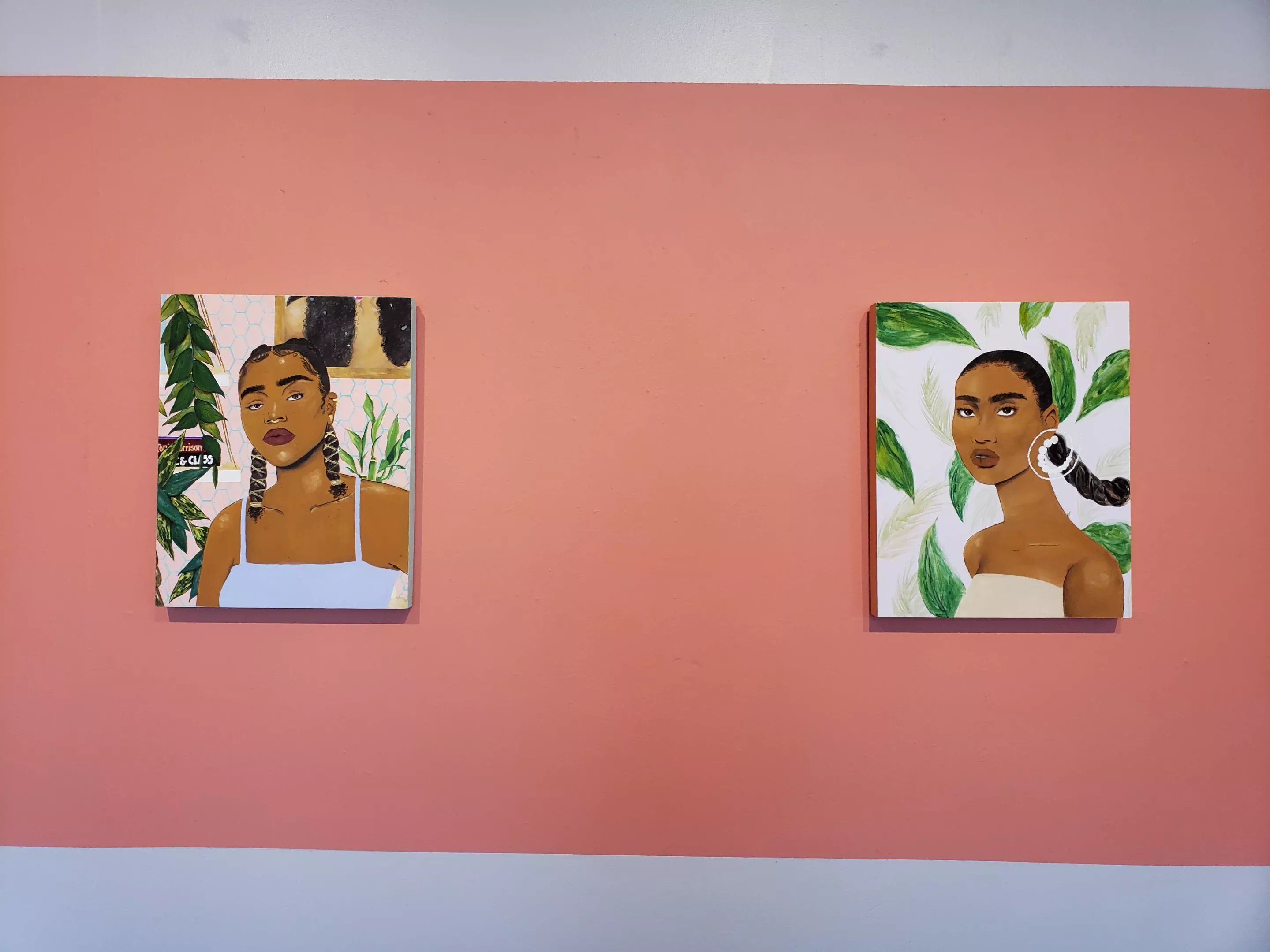 Another painting that deals with hair is “Unlearning.” Traditionally, black women have styled their baby hair – the fine hairs located around the edges of the face – in creative ways. Brielle says that this practice is now also common in a primarily non-black fashion world.