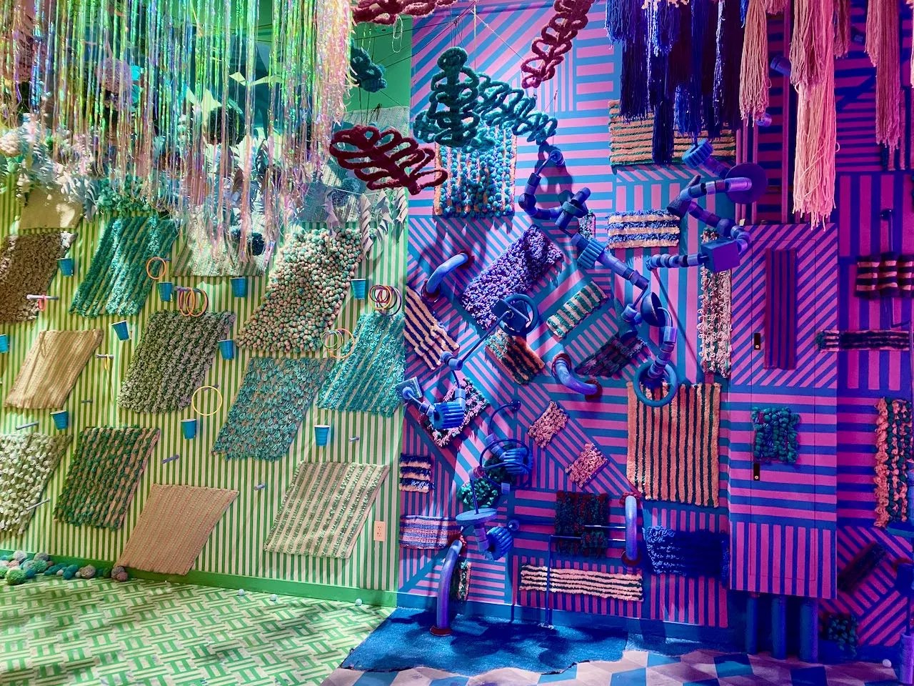 The room itself has a vibrant and warm sensuality to it. It’s an explosion of bright colors, muted by the soft textures of the yarn. At first glance, it feels like a hurricane-ravaged textile factory, but with just a tad bit of immersion, carefully engineered layers and structures are revealed.