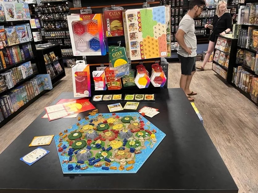 Common Ground Games co-owner DR Hanson says they’ve installed game demo areas in his store so players can test games before they buy them, like this topographic version of the popular territory gaining strategy game Settlers of Catan.
