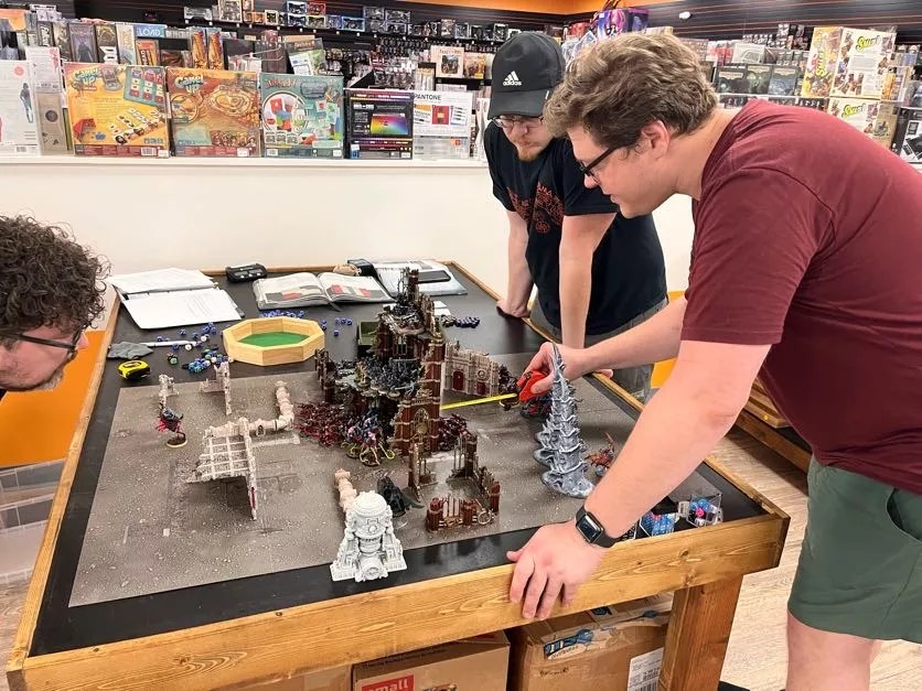 Beavan Blocker uses a tape measure to determine the melee attack range in a game of Warhammer 40,000 at the reopened Common Ground Games on Inwood Road.