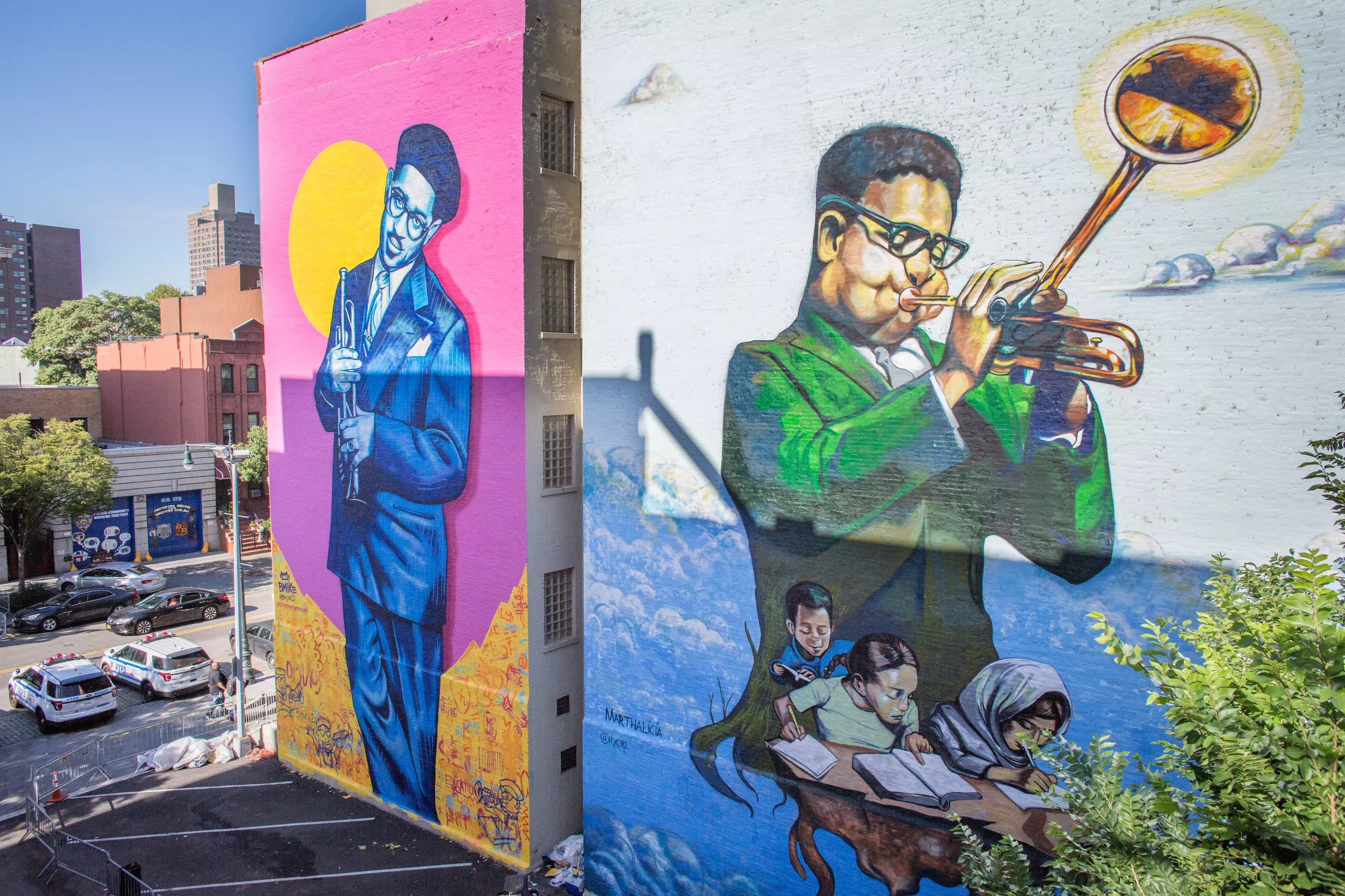 Murals espousing the importance of education and tying Harlem’s rich history to the Baha’i faith dot the neighborhood. A pair of murals depicting famed jazz musician Dizzy Gillespie, who converted to Baha’i, adorn two five-story buildings across the street from his plaque on the Harlem walk of fame.