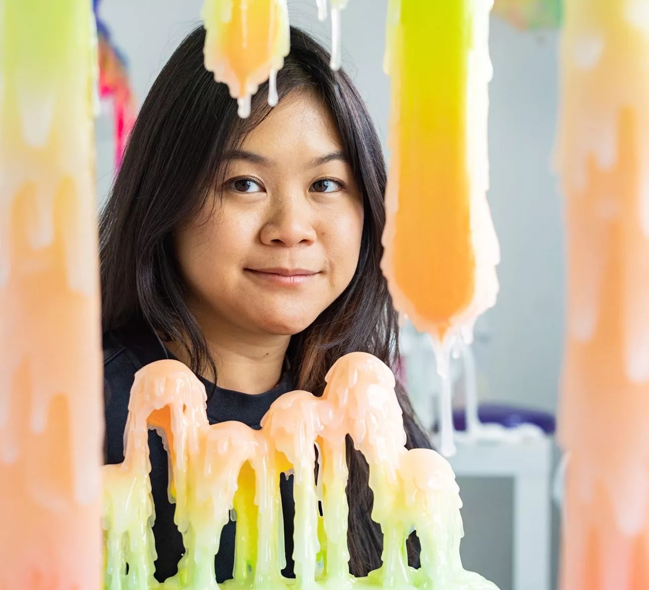 Dan Lam’s sculptures look like they were dropped on Earth from another planet. Enchanting, otherworldly and vibrant, her art flops off shelving in the form of drips, as blobs that colonize walls with neon color and as squishes climbing into iridescent towers.