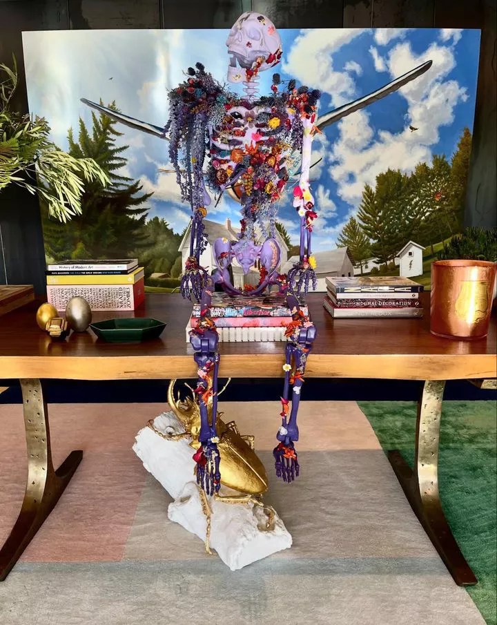The Dallas-based artist takes skeletons you can find at any Halloween store and transforms them with various materials (including shells, silk flowers, yarn, mirrored tiles, pearls and car paint) to make fantastical figures that recall everything from works of art to fashion collections from the likes of Alexander McQueen or Schiaparelli.