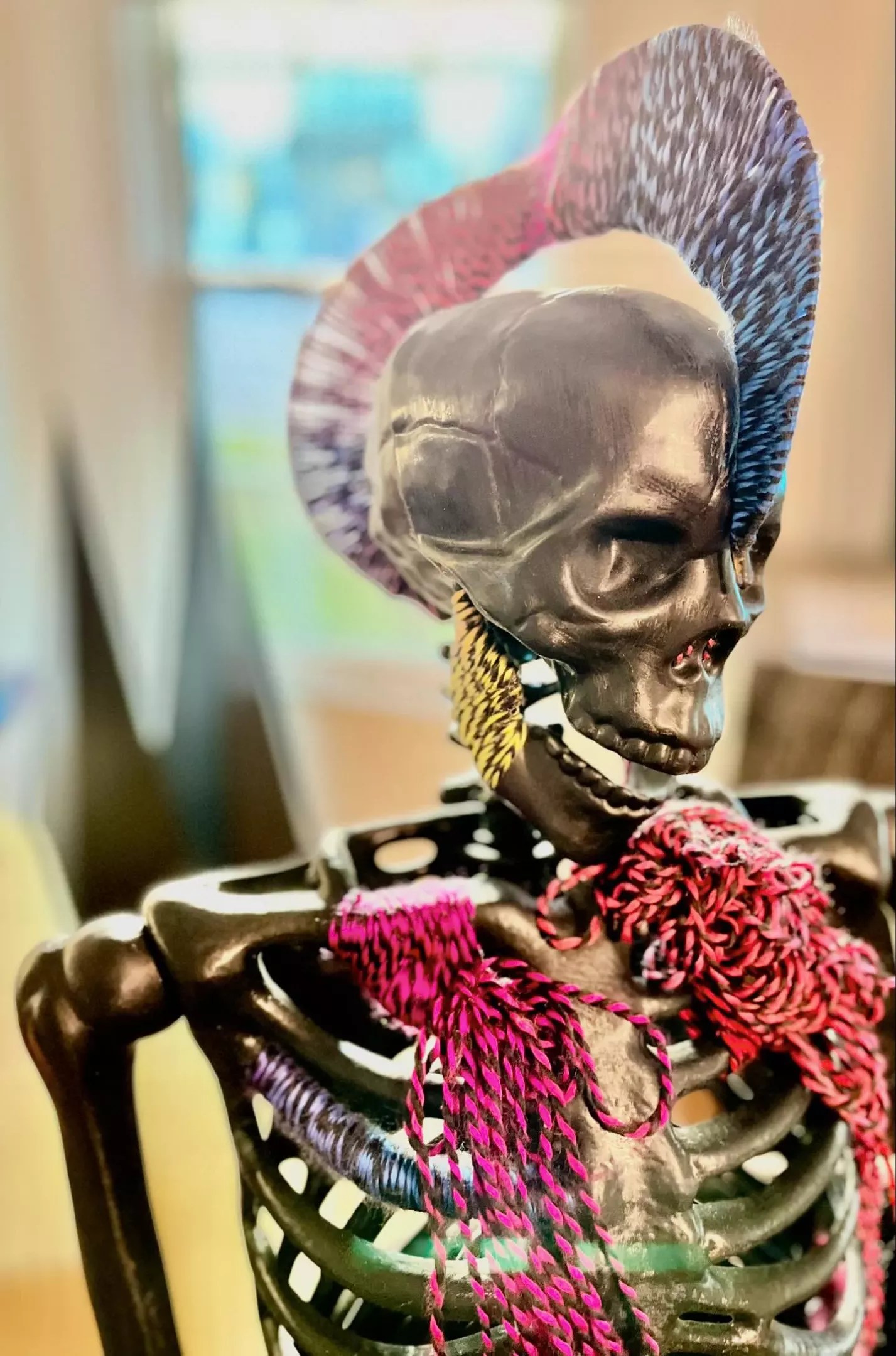 “[The skeleton] gave me the ability to go nuts, whether it’s beading, knitting or florals,” Thaxton says. “No two will ever be the same. I try to really go out of the box and test myself or challenge myself. I approach it from an artist’s standpoint and try to take the kitsch out of it and elevate it to a more artistic level. It’s not just your regular spooky decoration.”