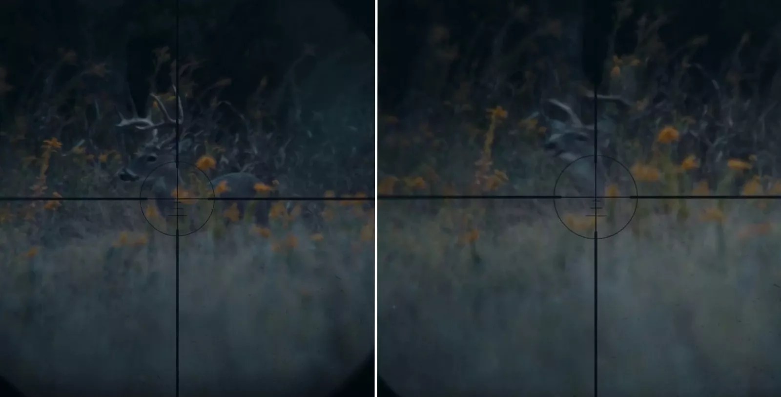 The camera cuts to a crosshair reticle showing the deer’s head peering above the grass. A breath of air is expelled followed by a loud gunshot. The deer’s head jerks back, pulling its body to the ground.