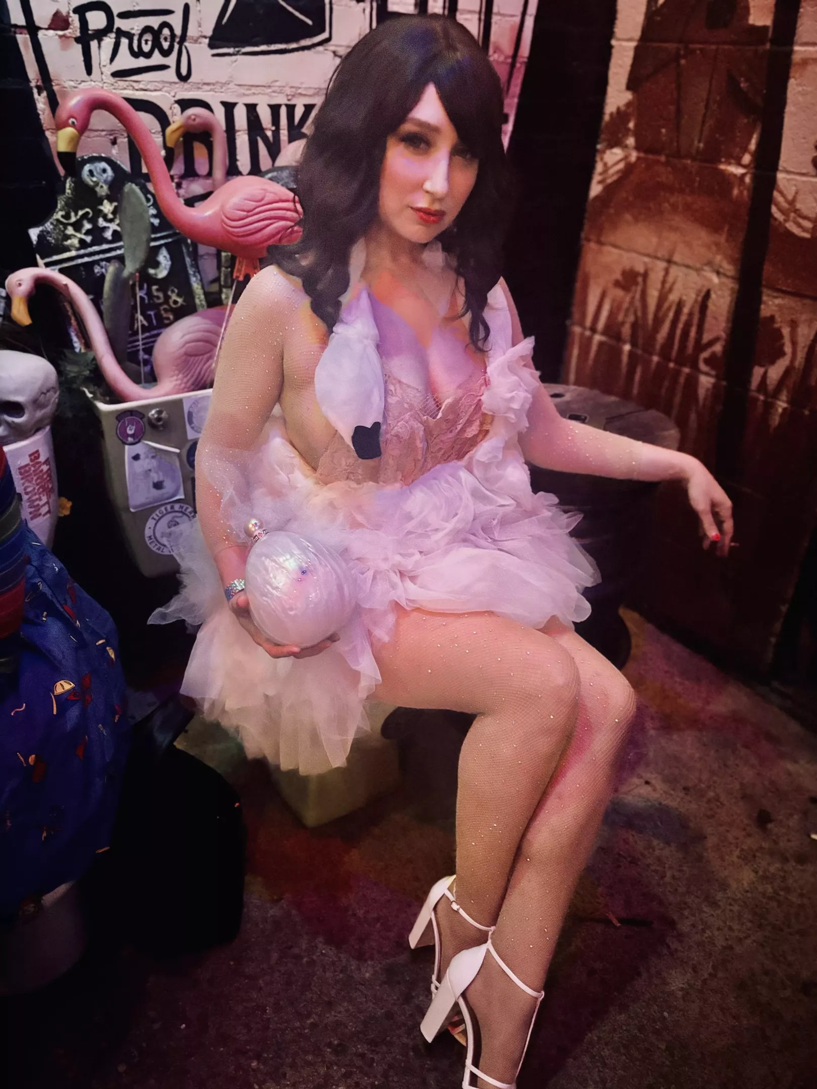 Burlesque dancer and DJ Melissa Meow sings a swan song as Bjork.