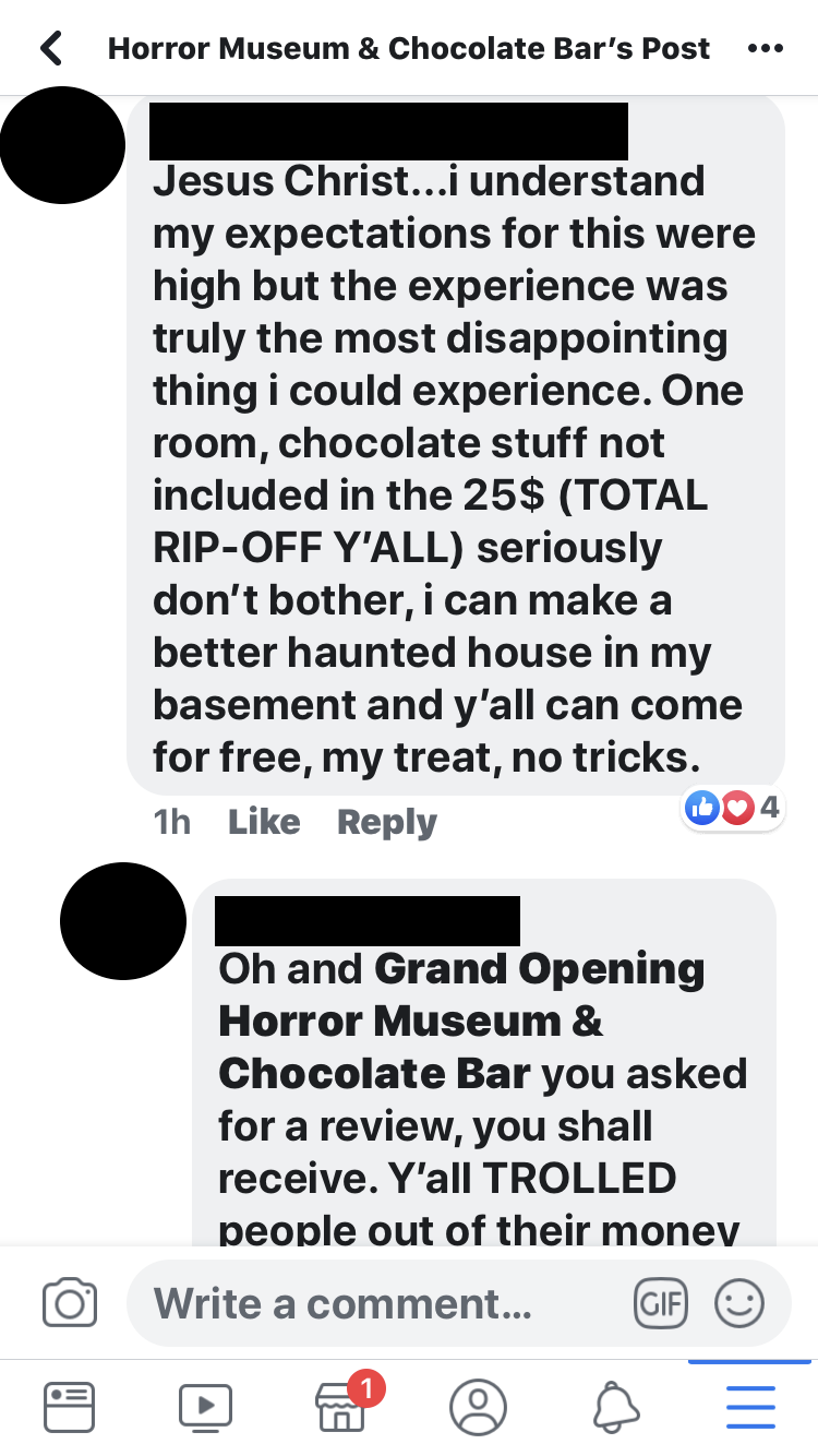 Customers posted angry comments about the Horror Museum & Chocolate Bar attraction on its Facebook page before the page came down at least twice since Friday evening.