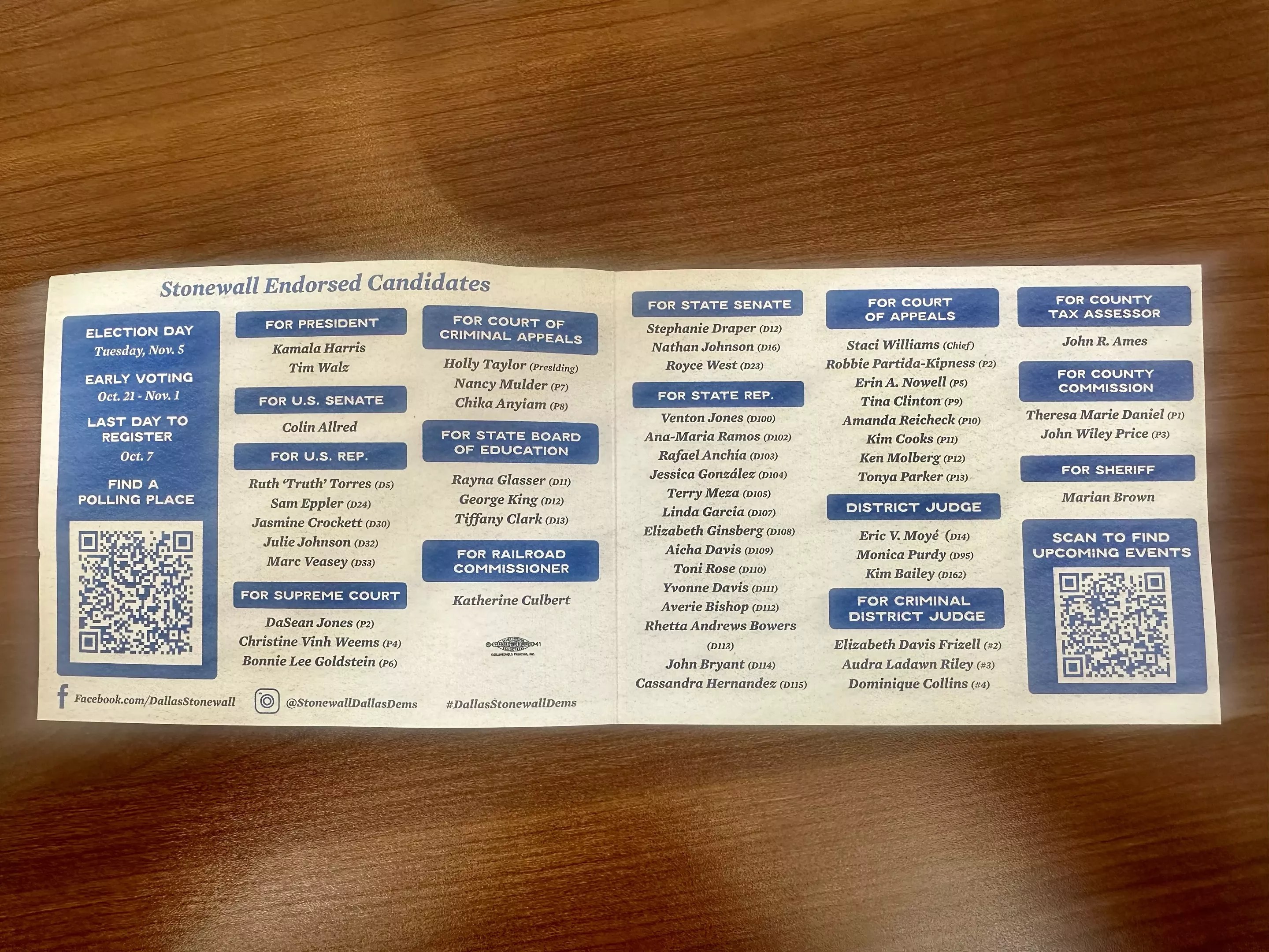 Gonzalez came armed with pocket-sized voting guides listing pro-LGBTQ candidates. High-profile Democrats Kamala Harris, Colin Allred and Jasmine Crockett were predictably at the top of the bill, but the guide included candidates all the way down the ballot, including John R. Ames for Dallas County tax assessor-collector and Katherine Culbert for railroad commissioner.