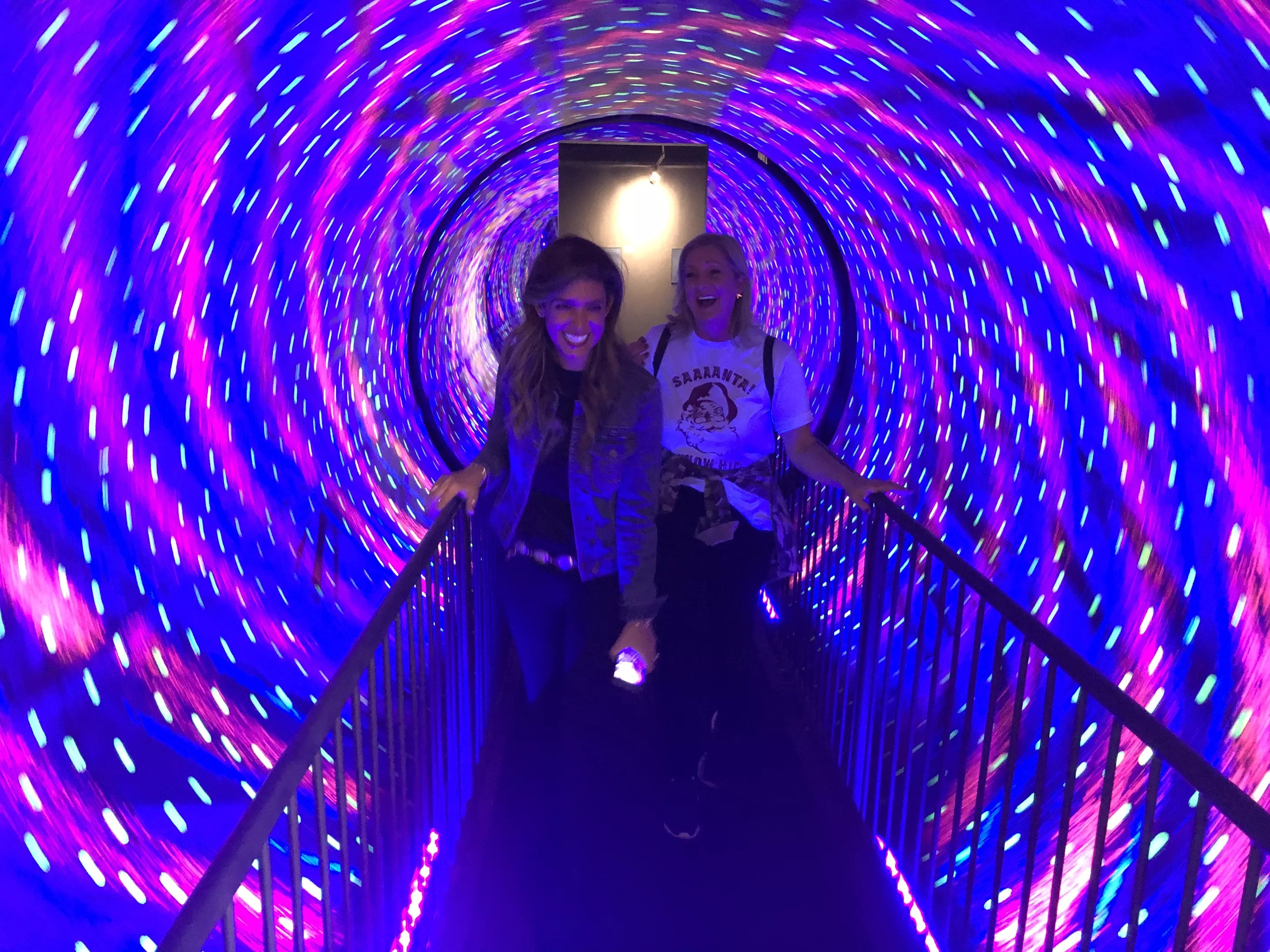 Neda Khalilian (left) and Wendy Long (right) take a mind-dismantling walk through the Vortex Tunnel at the Museum of Illusions.