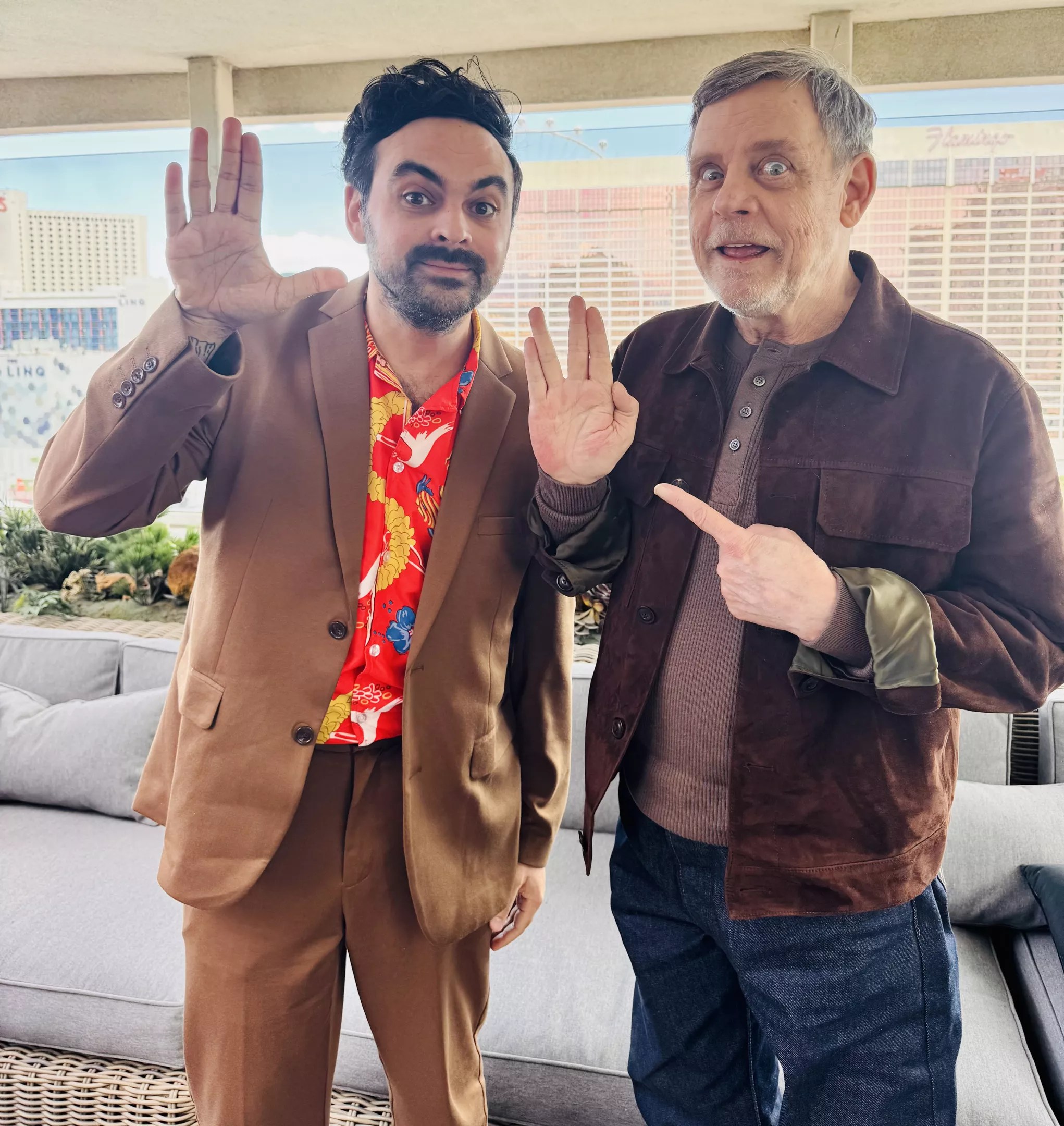 Wallace shares an April Fools Day joke with Star Wars icon Mark Hamill as they flash the Star Trek Vulcan salute at CinemaCon 2025.