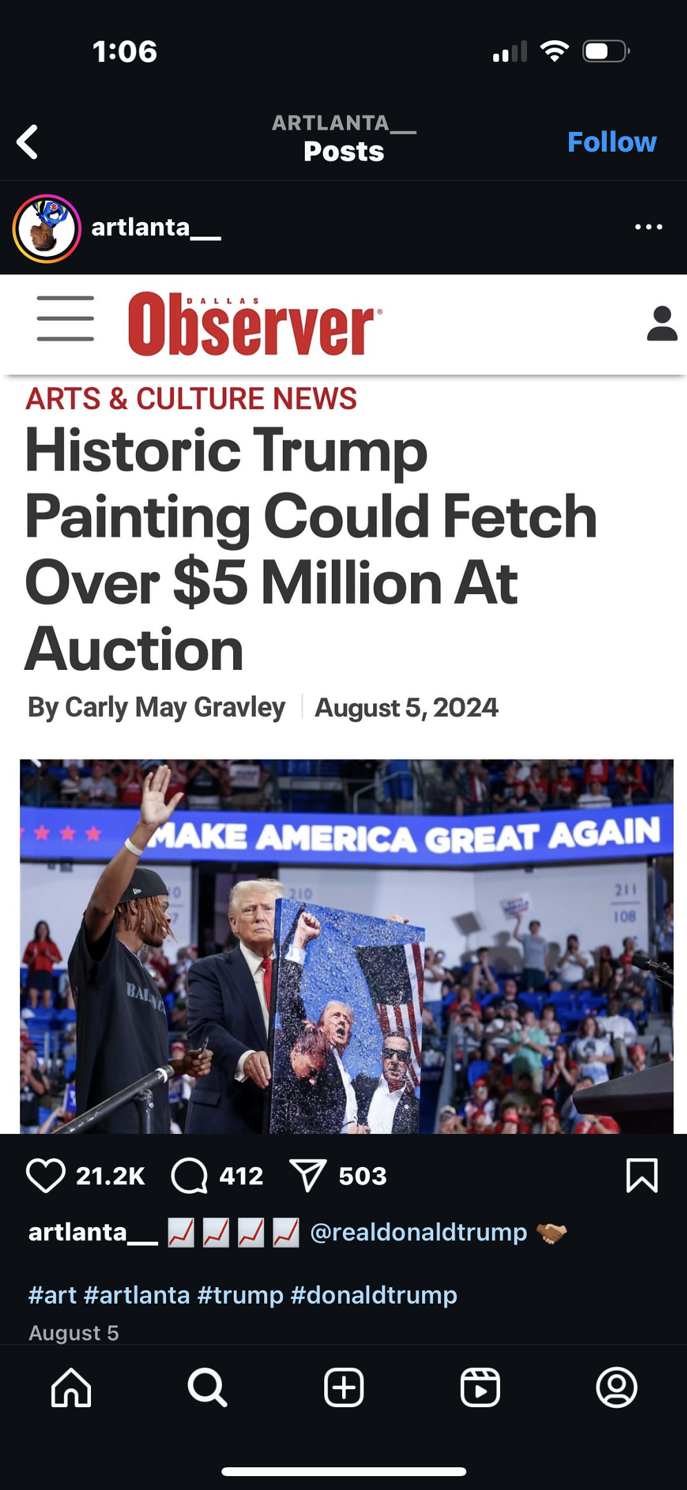 Predictably, the account that posted the screenshot belongs to the creator of the painting, an Atlanta-based artist who goes by Artlanta. He has multiple subsequent posts about the painting (including one where the price is bumped up to $10 million), but the purported Observer story is the only news article he shared. Lucky me for getting that scoop, right?