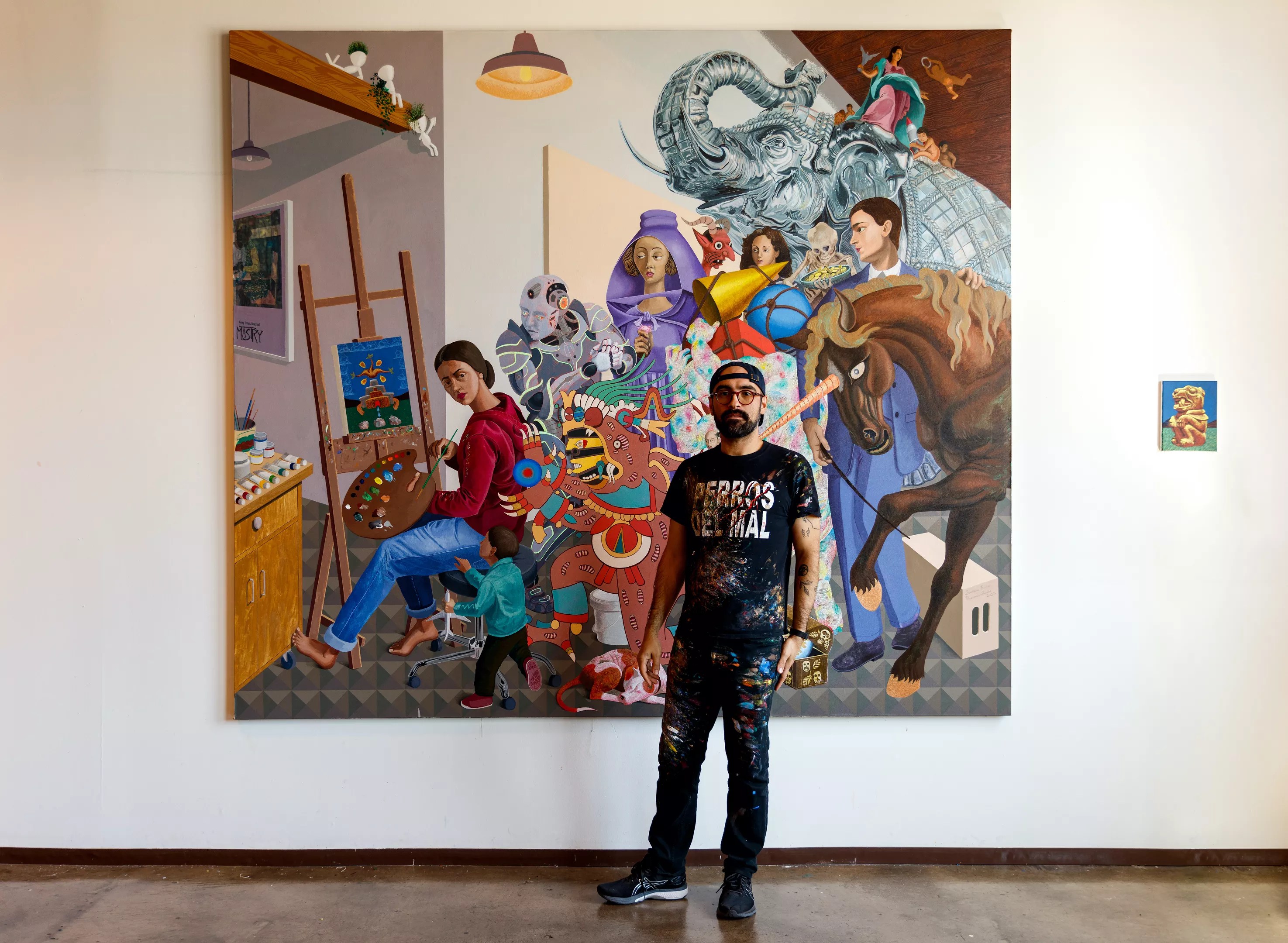 “The great thing about a painting is that it’s my vision through and through, delivered to the gallery uninhibited by unaccountable elements. It’s also a practice in restriction,” Moreno says. “How do I make a painting that is all me? Simplifying my vision to a rectangle is the hardest challenge as a maximalist.”