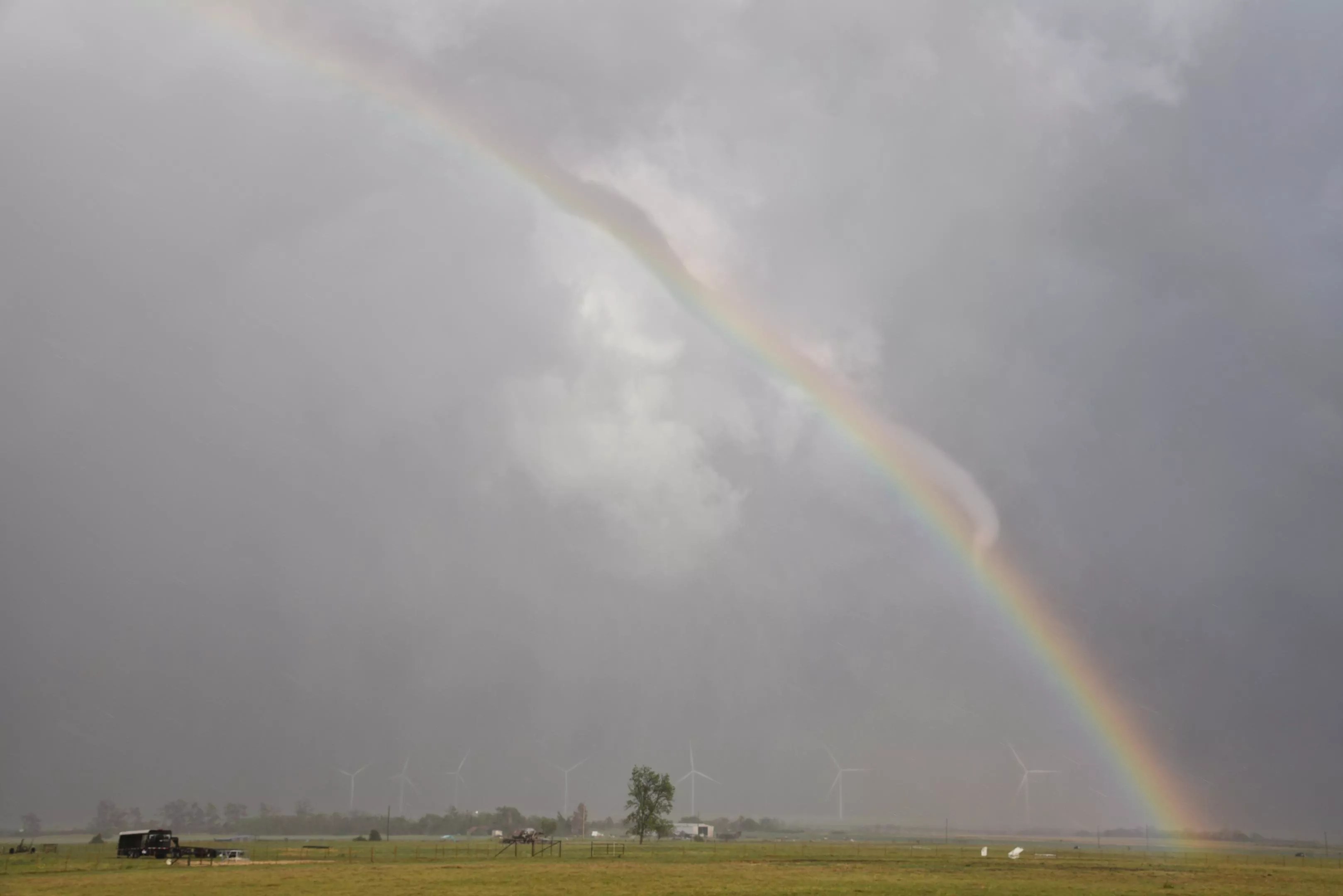 A tornado appears to entwine itself around a rainbow.