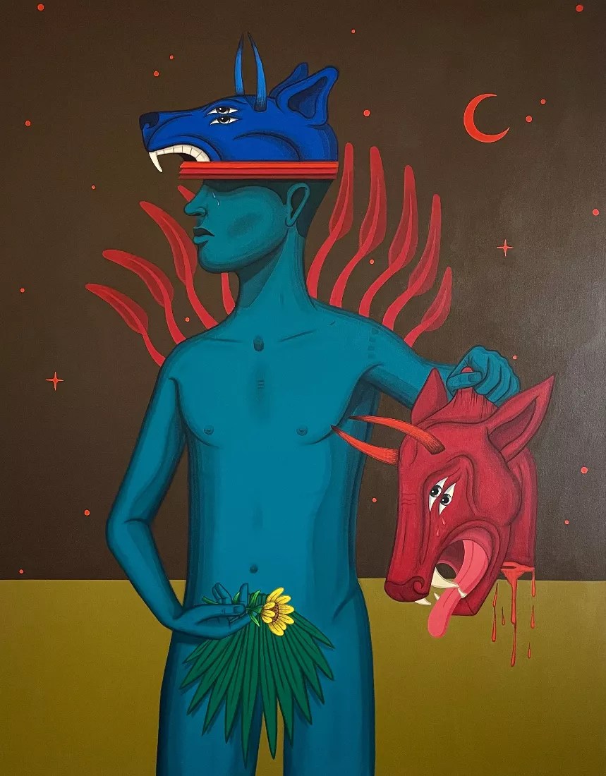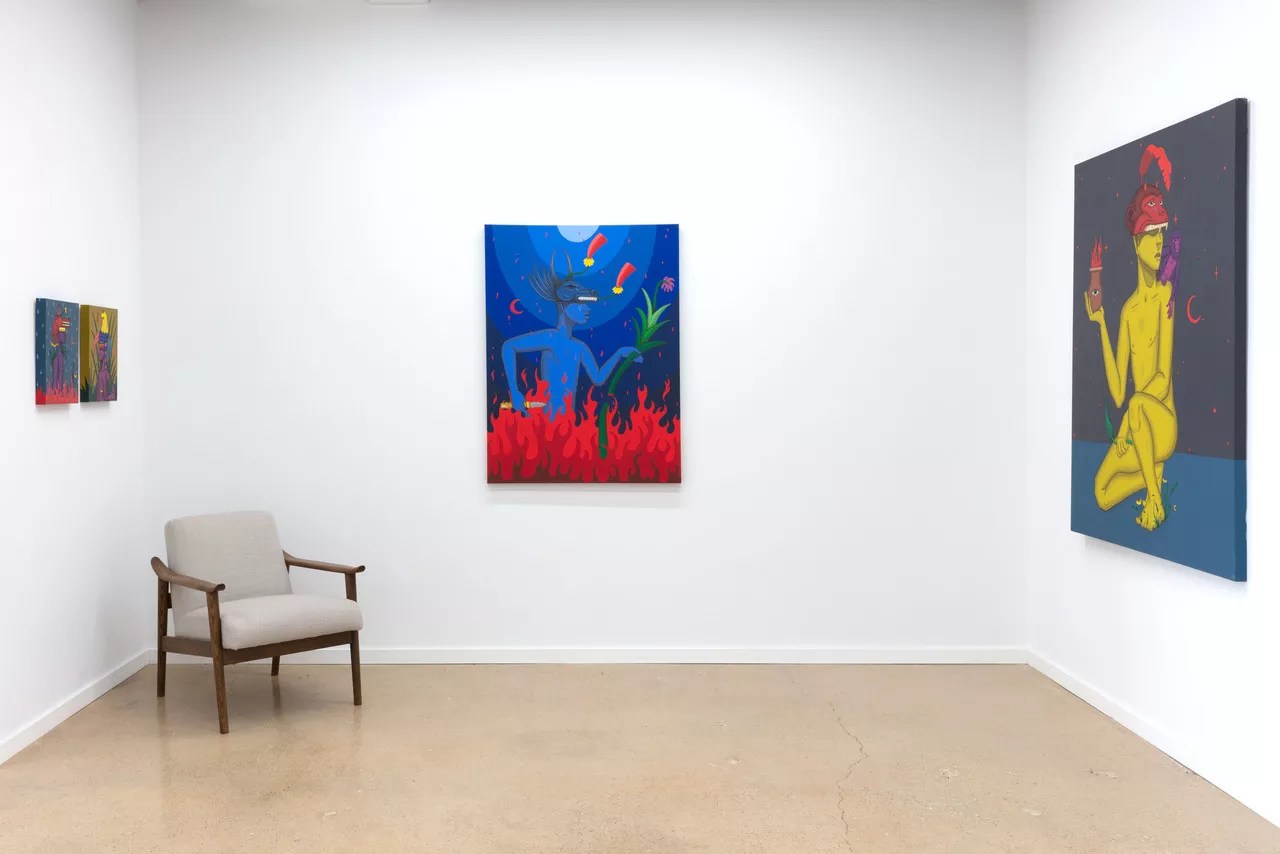 Painted in a flat, graphic style, the subjects of the artist’s first-ever gallery show, Flowers in the Dark at Erin Cluley Projects, seem to embody an ancient ritual. Inspired by the Cereus repandus or Peruvian apple cactus, his work also references the experience of healing through adversity, a career theme for the artist otherwise known as Eric Gutierrez Rodríguez.
