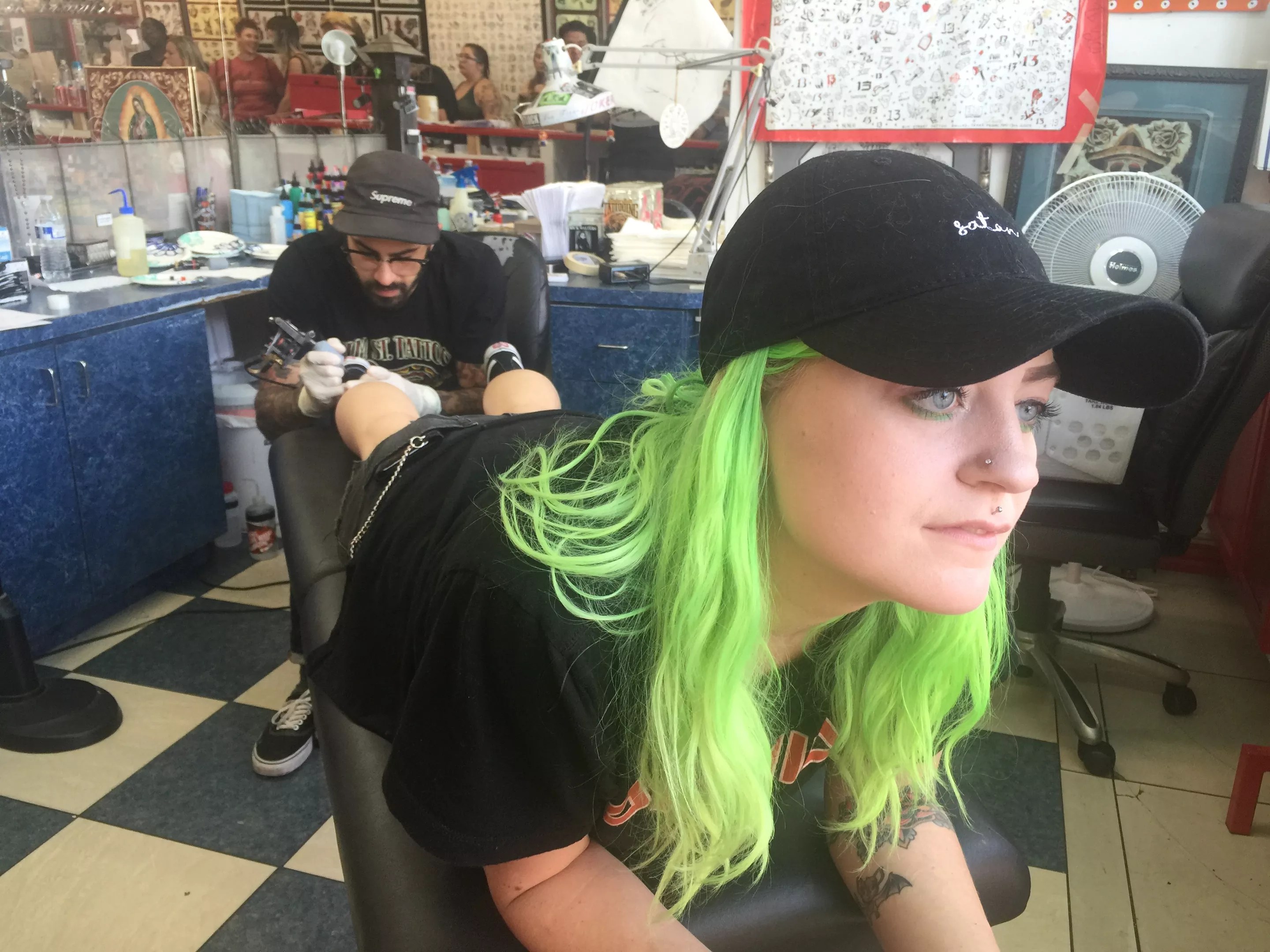 The line starts outside the tattoo parlor and sometimes