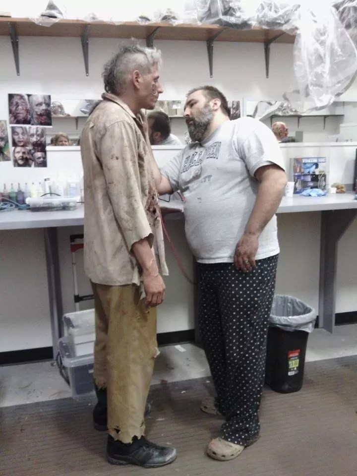 Anderson handles prosthetic applications and Macabre works on airbrush makeup while a crowd organizer sends performers where they need to go in the makeup room before showtime.