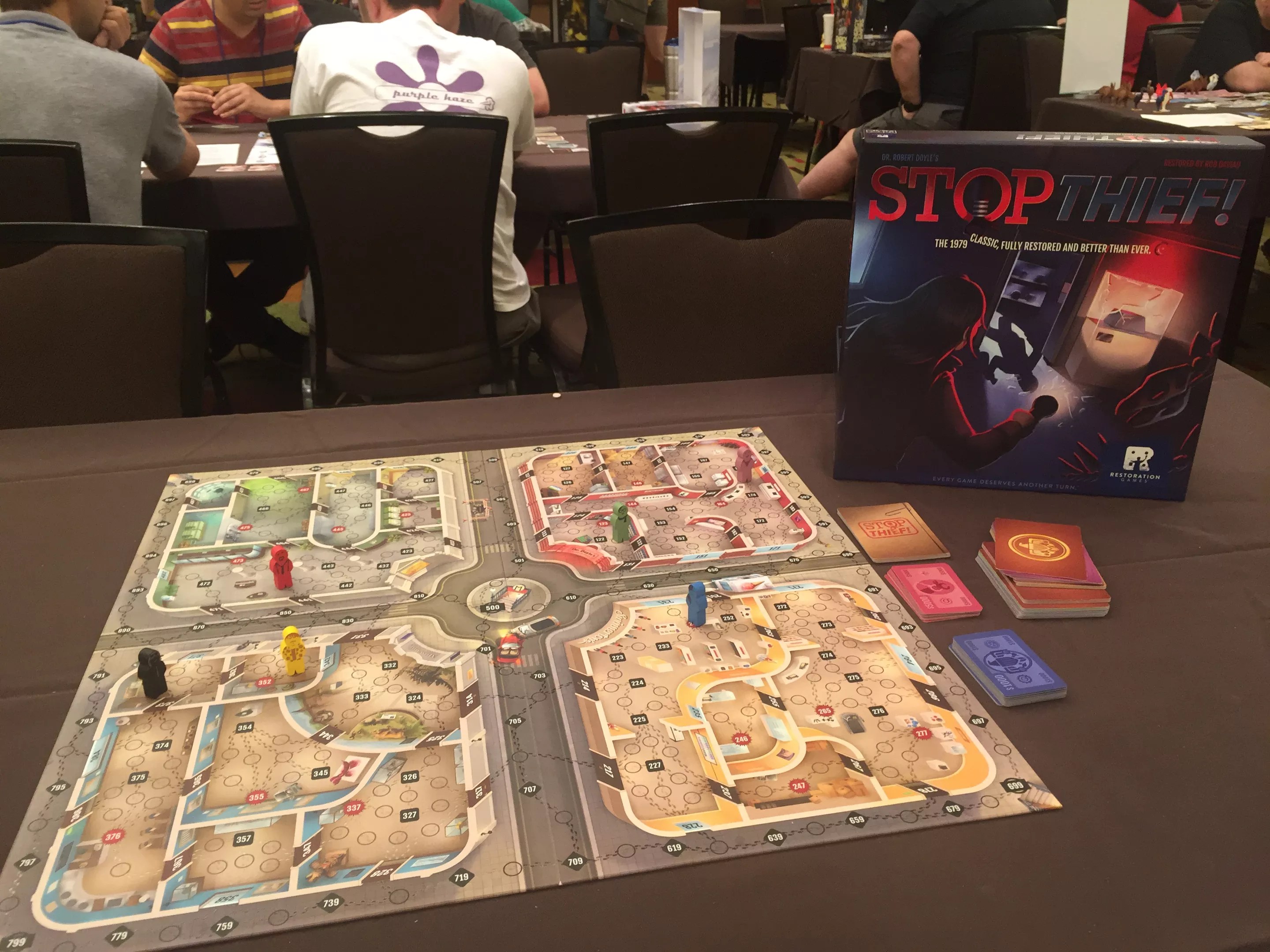 Stop Thief, created by and rereleased with the blessing of former NASA scientist Robert Doyle, turns board game players into civilian bounty hunters who chase down thieves as they commit crimes in a town square occupied by stores, a bank and a museum. The only hints that the thieves give them are the noises they make as they flee the scene, like broken windows, creaking doors