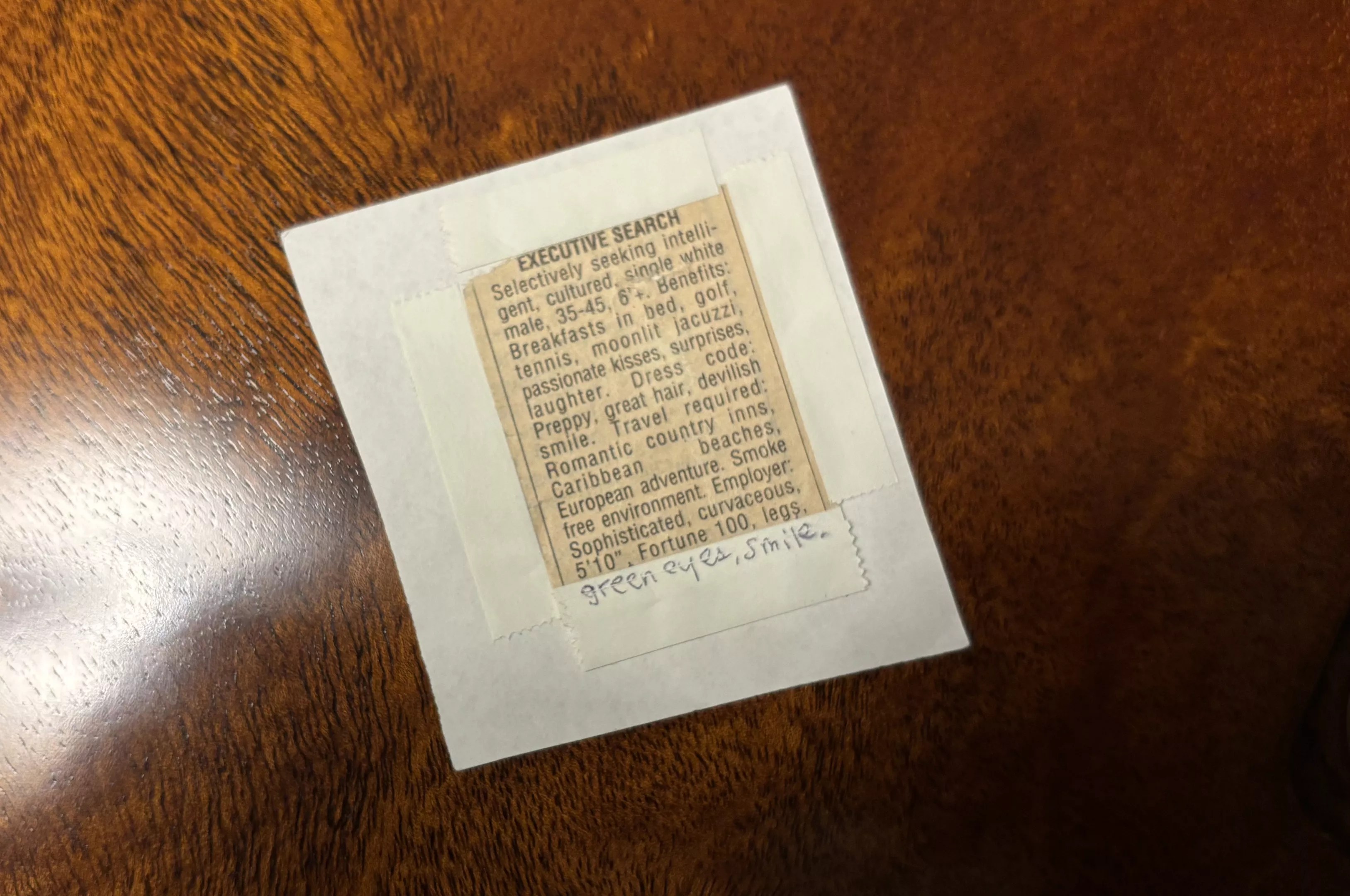 “Selectively seeking intelligent, cultured, single white male, 35-45, 6’+. Benefits: Breakfasts in bed, moonlit jacuzzi, passionate kisses, surprises, laughter. Dress code: Preppy, great hair, devilish smile. Travel required: Romantic country inns, Caribbean beaches, European adventure. Smoke free environment. Employer: Sophisticated, curvaceous, 5’10”, Fortune 100 (though this was a typo and should have been ‘Fortune 500’), legs, green eyes, smile.”