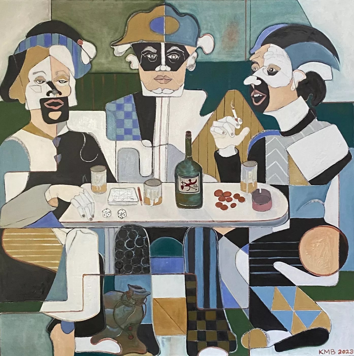 The exhibition highlights one of her large, new works, “Liar, Cheat, and the Thief,” depicting three men made from shapes and patterns playing dice at a table. Unlike her other portraits, which she typically names after seeing the final product, this topic was inspired by her husband and represents an intentional scene.