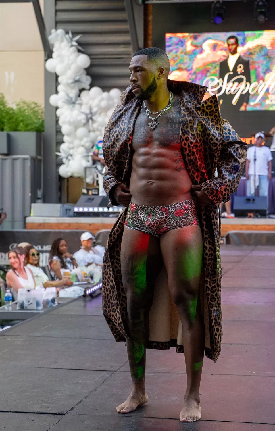 A SuperFine x LifeStyle model poses at the end of the runway.