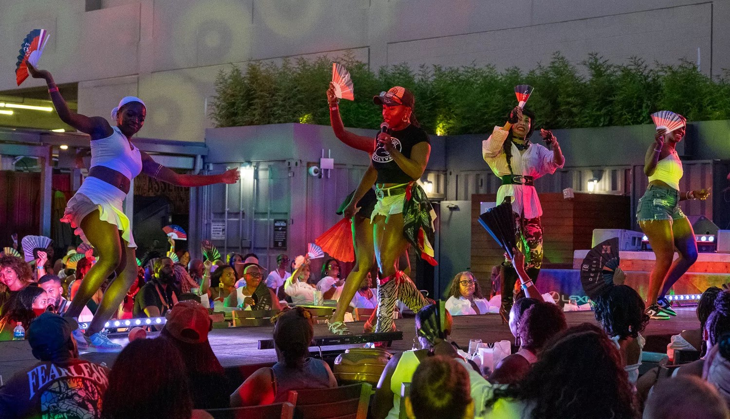 Guests popped their fans and competed in a line dance for a prize at the annual Juneteenth fashion show at the Lexus Box Garden.