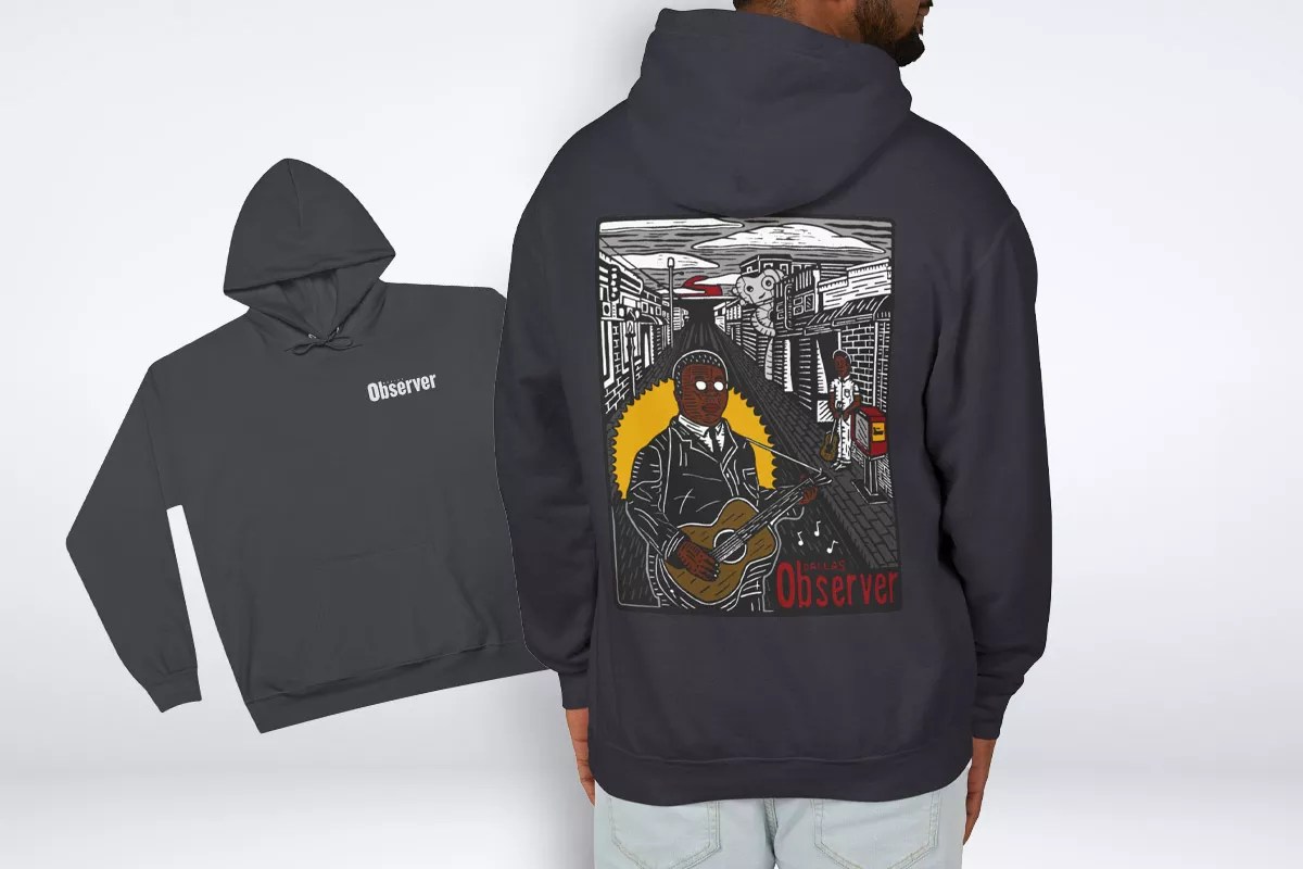 By becoming a Dallas Observer member and giving at least $20, you are eligible to receive a poster featuring Jackdaw’s design. If you up your contribution to $75 or more, you can also receive a hoodie or crewneck (your choice). Already a member? Keep an eye on your email for details on how to get your items.