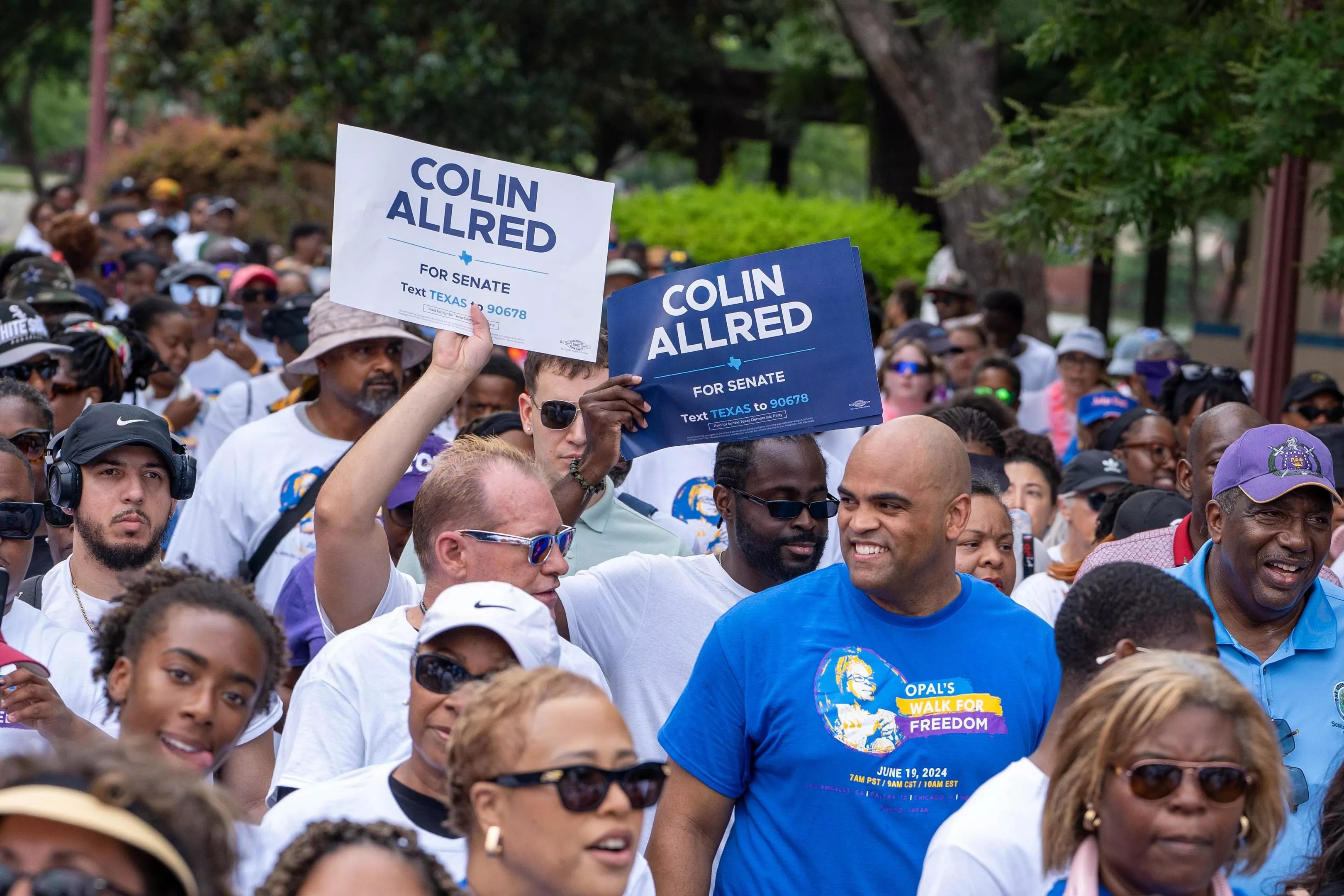 Democratic U.S. Senate candidate Colin Allred, in the blue T-shirt, joins the crowd.