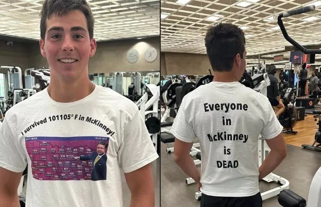 Delkus posted photos on his Facebook page of someone at the gym sporting a Delkus T-shirt complete with a photo of the weatherman’s viral moment and beneath it the phrase, “I survived 101105° F in McKinney.” Then on the back, the shirt sports Delkus’ famous quote about the Collin County city – a nightmare scenario that will probably happen in the distant, dire future if we keep ignoring the existence of climate change.