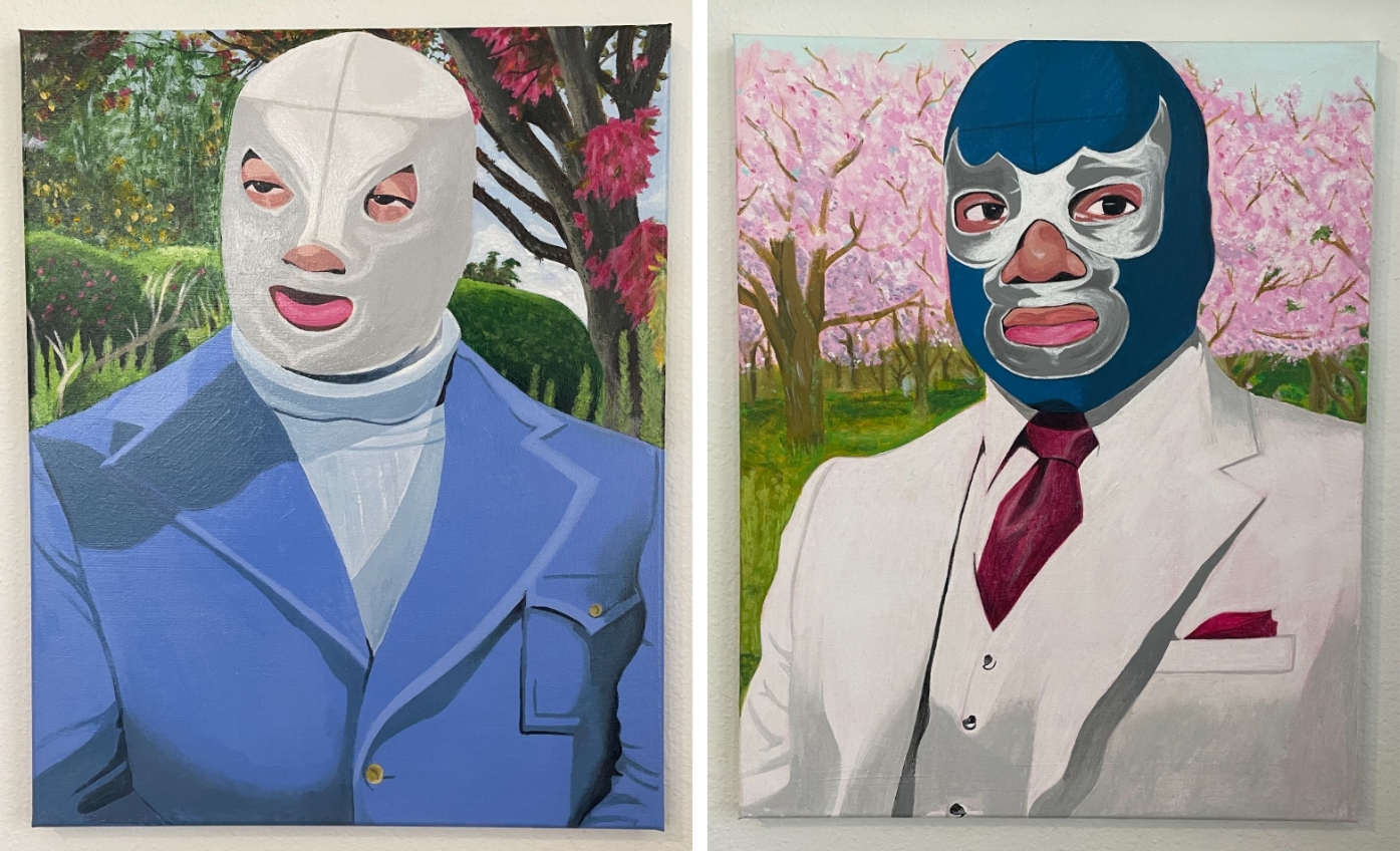 His first two paintings were portraits of wrestlers Jushin “Thunder” Liger and the Blue Demon, both wearing traditional luchador masks, but with suits on instead of spandex tights. Moriarty has long been fascinated with Mexican pro wrestling culture. His first trip outside of the country was to Mexico to train with luchadores.