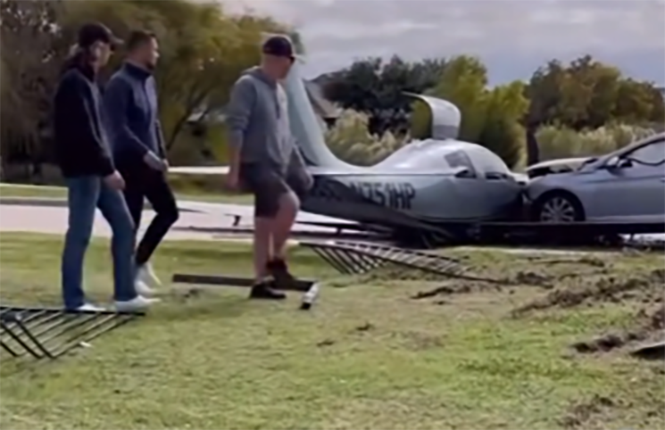 The plane had attempted to land on the runway at Aero Country Airport but overshot the landing. The plane bounced off the ground, smashed through a fence and collided with a car “that was driving perpendicular to the single-engine planet’s path,” according to the Associated Press.