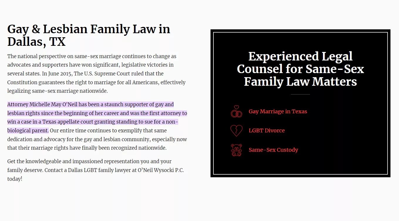 O’Neil has been practicing family, appellate and civil law in Texas since 1992, according to the State Bar of Texas. The Texas Board of Legal Specialization made her a family law specialist in 1997, and she has dedicated a good portion of her practice to helping LGBTQ couples with child-custody cases in Texas, a state not known for being friendly to same-sex couples, especially when it comes to children. The firm even had a webpage dedicated to this side of the practice at LGBTtexasfamilylaw.com, but the page came down earlier this week and now points to another firm that practices family law with a specialty in LGBTQ+ cases.