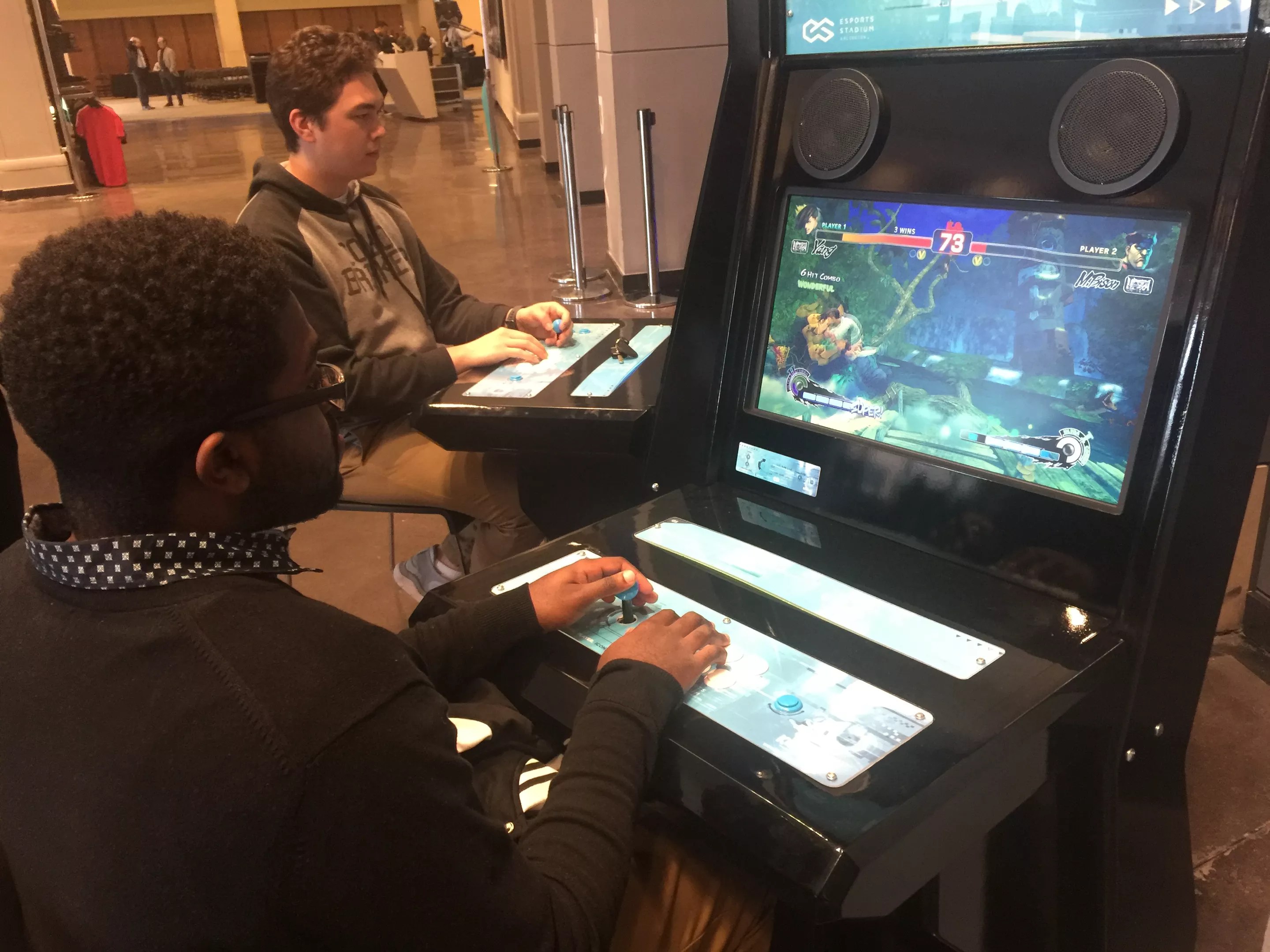 Jarilous Holliday faces off against Jonathan Ohua in a round of Ultra Street Fighter IV on one of the arcade terminals located in the Arlington Esports Stadium’s lobby.