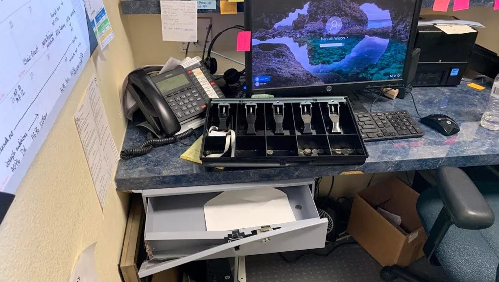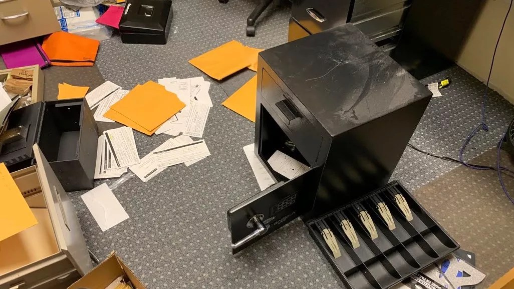 Once inside the offices, the burglars broke into safes and cash drawers and took as much cash and as many high-priced items such as iPhones and iPads as they could find. Blair says the burglars also caused some damage to the building’s heavy-duty doors by hammering on them and used “brute force” to open the safes. They also left a large pile of clutter for the staff to pick up once police officers completed their investigation.
