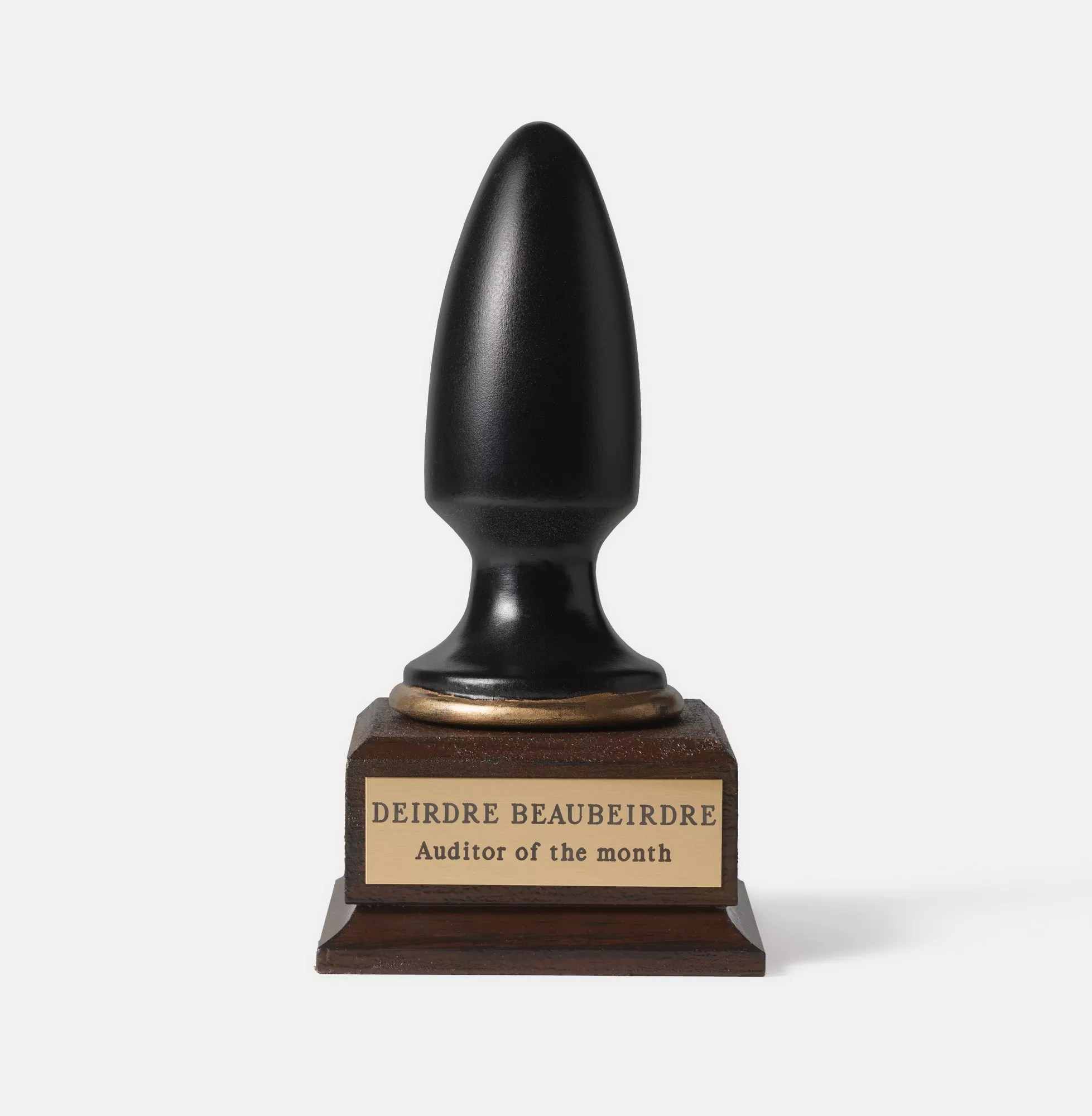 You knew this was coming. Just like when you were watching the movie and you first saw the award on the desk of the IRS auditor Deirdre, played by Jamie Lee Curtis. From the moment you laid eyes on it, you just knew somehow that at some point, it was going to go up someone’s butt. Nothing could prepare you for it. You probably even forgot it existed until the moment it happened. So, not only can you have a piece of movie history that we hope has been Scotchguarded, but this trophy can also serve a much higher purpose than just flaunting your wealth. You can make people have that same feeling when they come into your home and see it on the shelf. “It’s only a matter of time,” they’ll say to themselves.