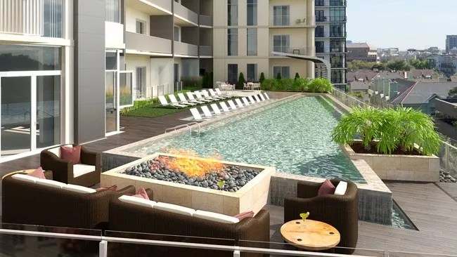 Just barely missing our top spot, the Residences is right along Klyde Warren Park on the Uptown side. By its location alone, it should come as no surprise that a 782-square-foot unit in the building starts at more than $2,500 per month. Having Klyde Warren at your doorstep is pretty cool and perhaps even worth the price these apartments command alone. Luckily these Residences don’t skimp out on the amenities, which, among other things, include one of the coolest rooftop infinity pools on this list.