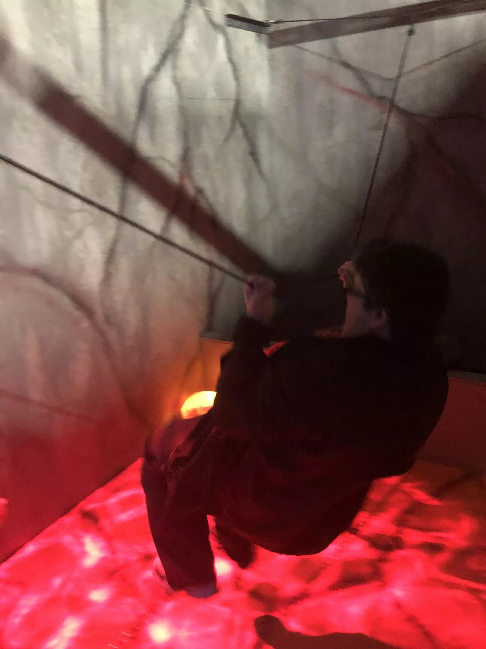 Writer Danny Gallagher attempts to cross (and fails spectacularly) the lava pit on a tightrope at the Lewisville Labyrinth.