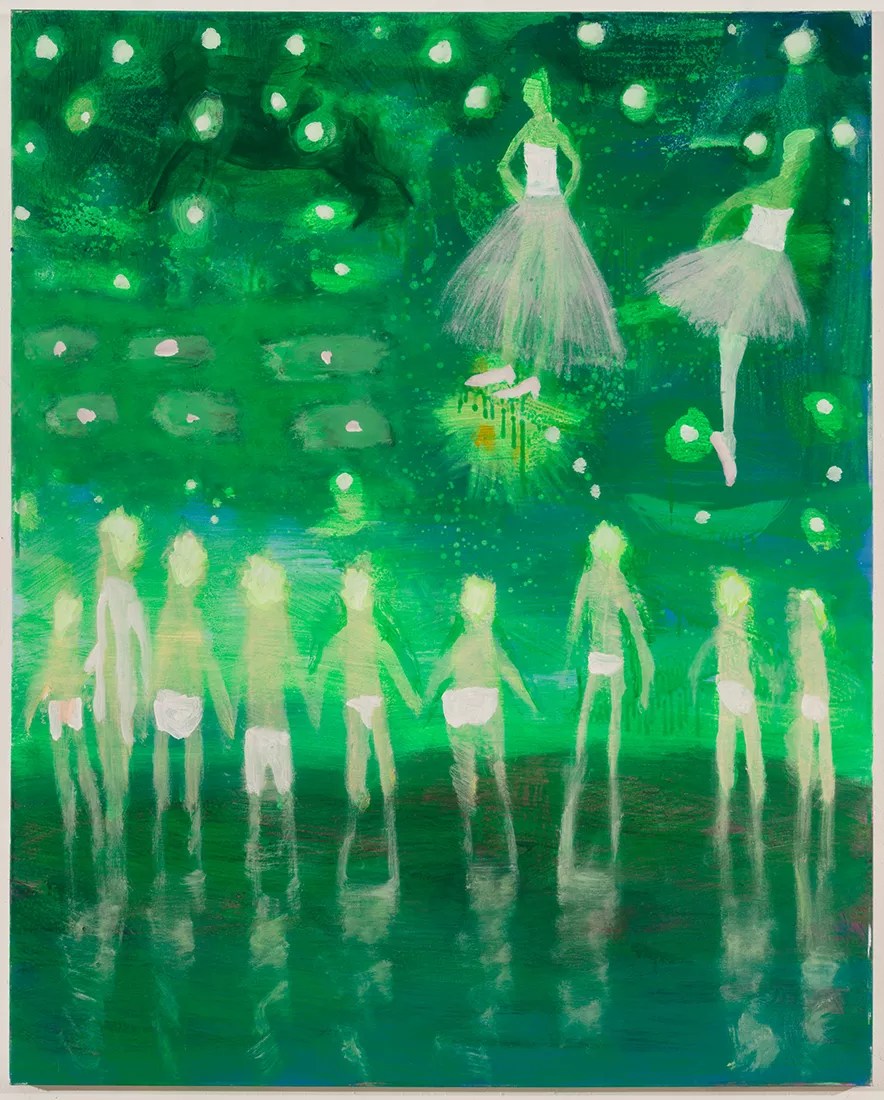 The work of abstract painter Katherine Bradford graces the Metropolitan Museum of Art, Brooklyn Museum of Art and, soon, the Dallas Museum of Art. A New Yorker, Bradford is also the recipient of a Guggenheim Fellowship, among numerous other awards. Delahunty calls “Prom Swim” “refined.”