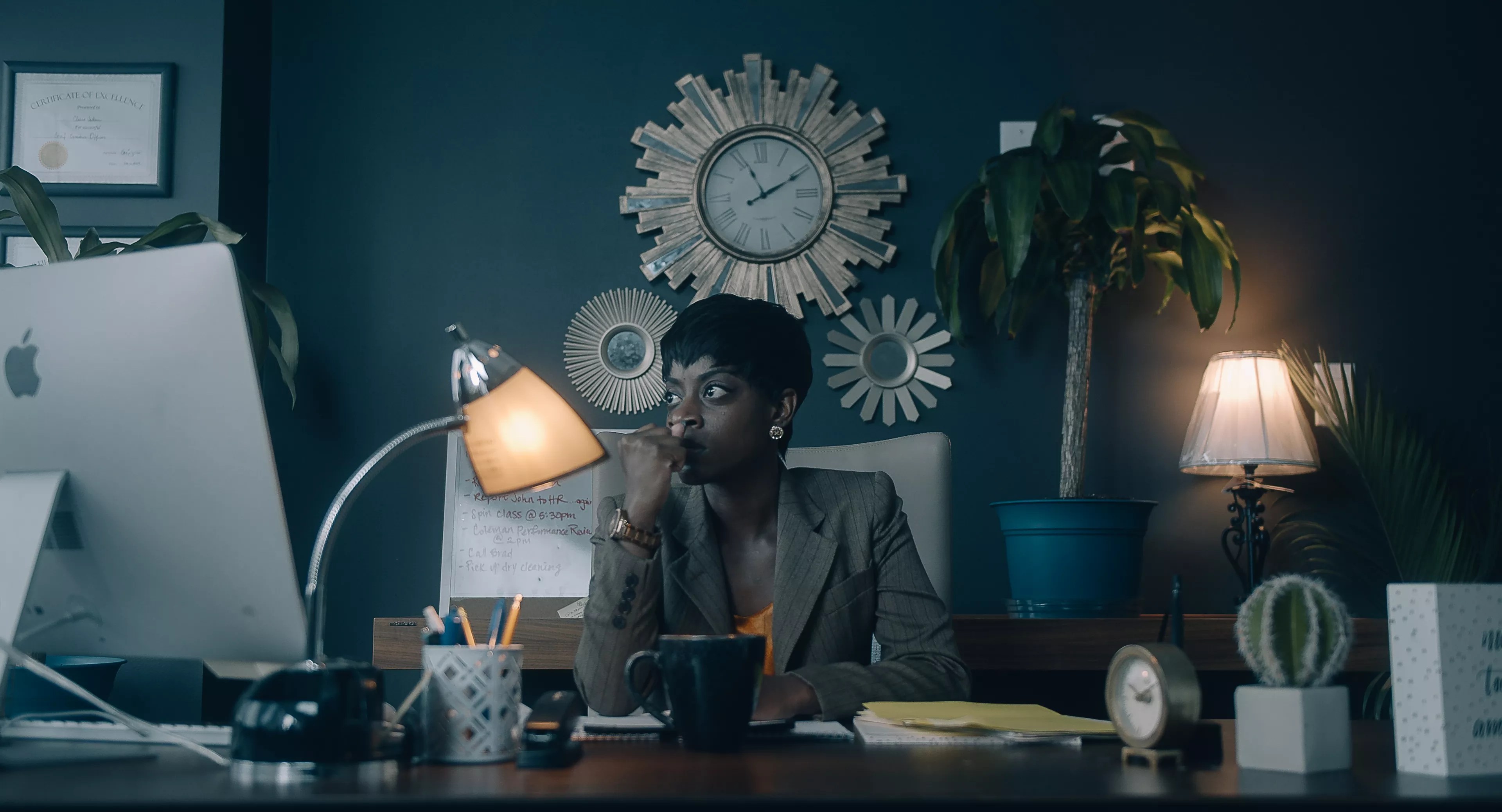 Claire, played by Brittney Bluitt, agonizes over her department's declining sales, which may lower her executive compensation in the second season of the dramedy series #WASHED.
