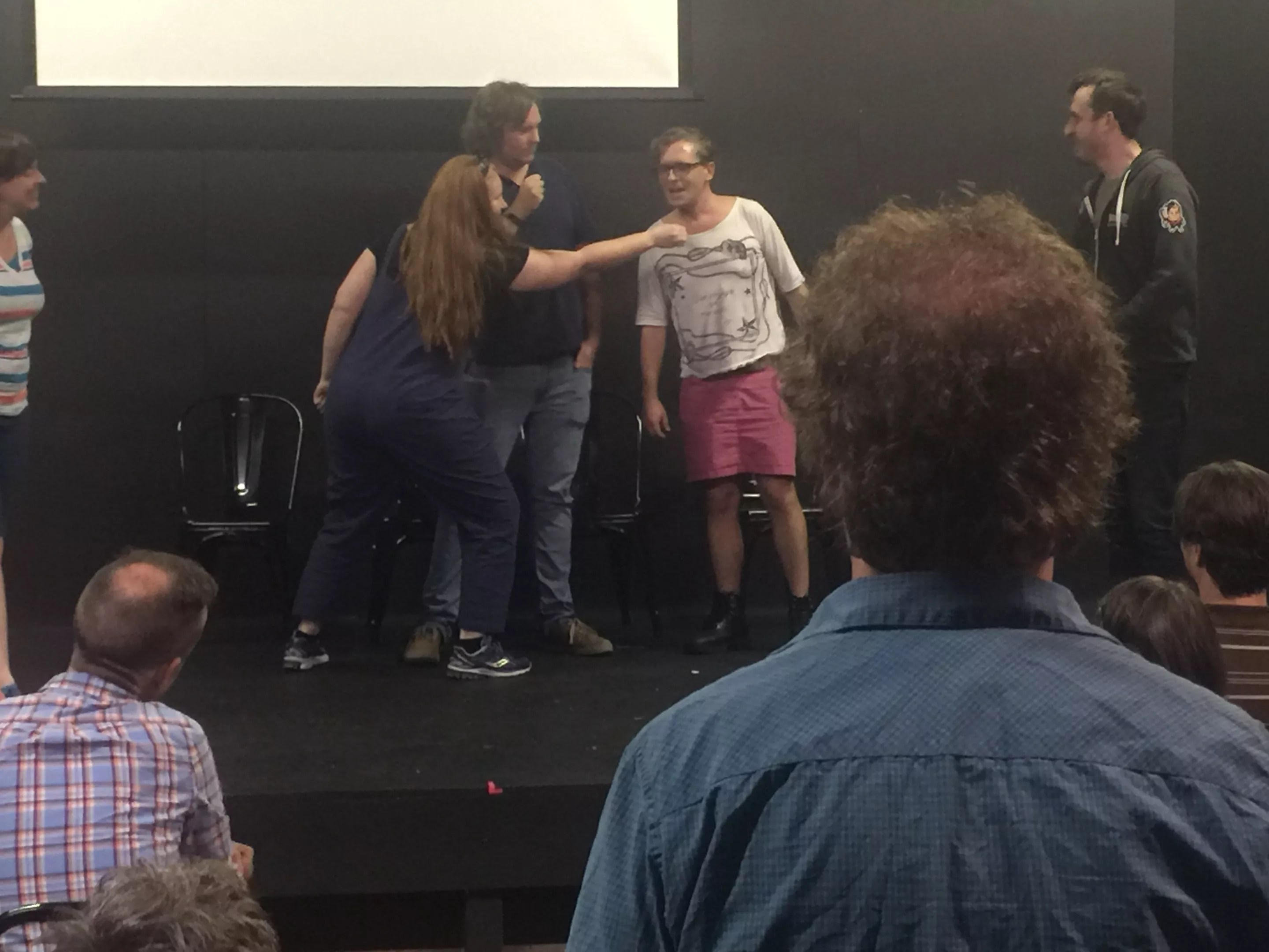 Kevin McDonald, right, watches a group of students improvise a scene at Stomping Ground that will eventually become the basis for the sketch they will write for their show at the end of the workshop.