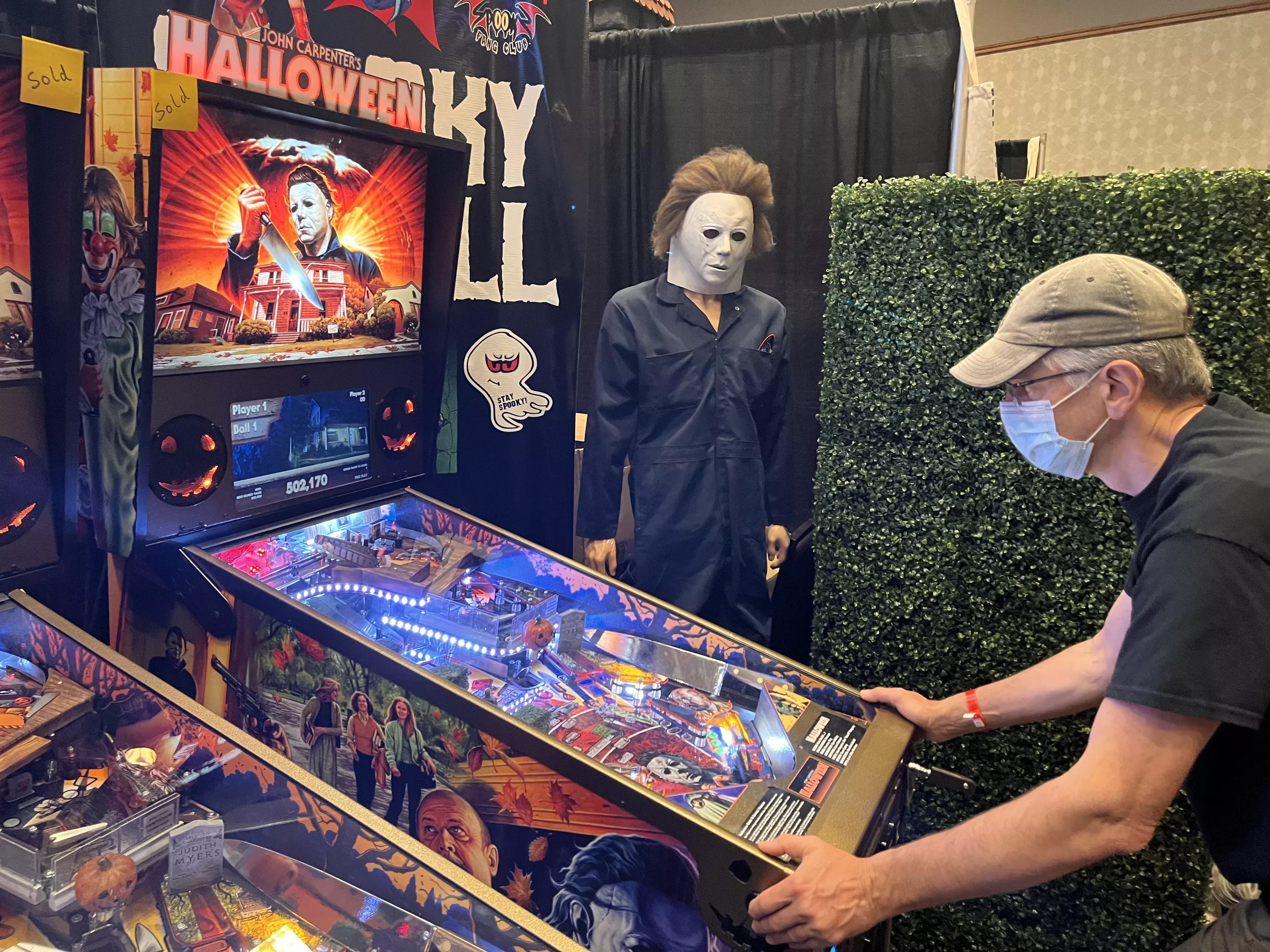 A dummy of Michael Myers (or is he real?) looms over a player testing out the new John Carpenter’s Halloween pinball game from Spooky Pinball at the Texas Pinball Festival in Frisco.