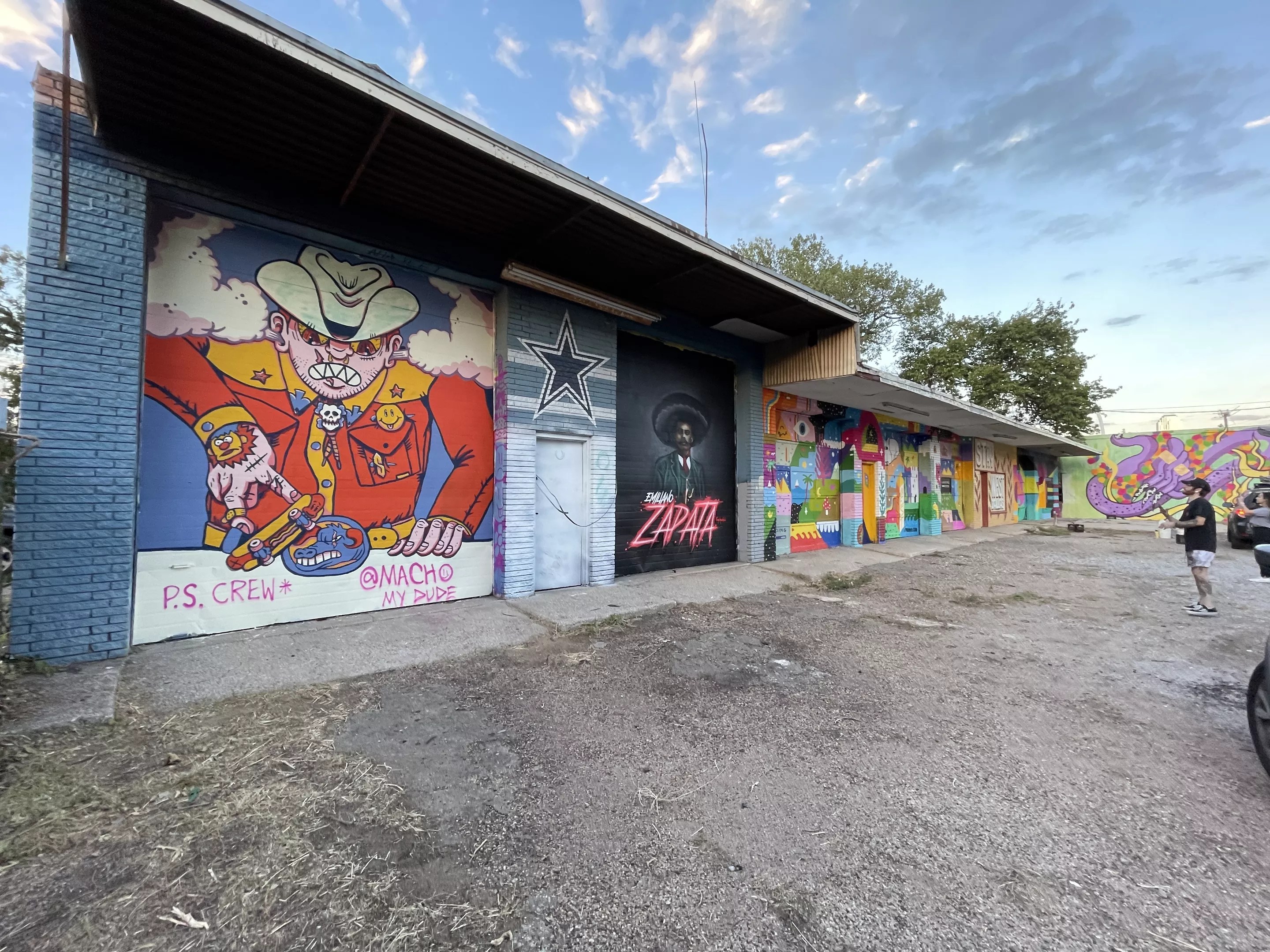 2-D artist Macho My Dude dropped his first-ever mural featuring Big Tex toying with a finger skateboard as part of the fest. Next to it is a rainbow mix of trippy iconography from Oklahoma artist Pyramid Guy from the Plaza Walls Crew, which operates an artistic exchange of sorts with Dallas muralists.