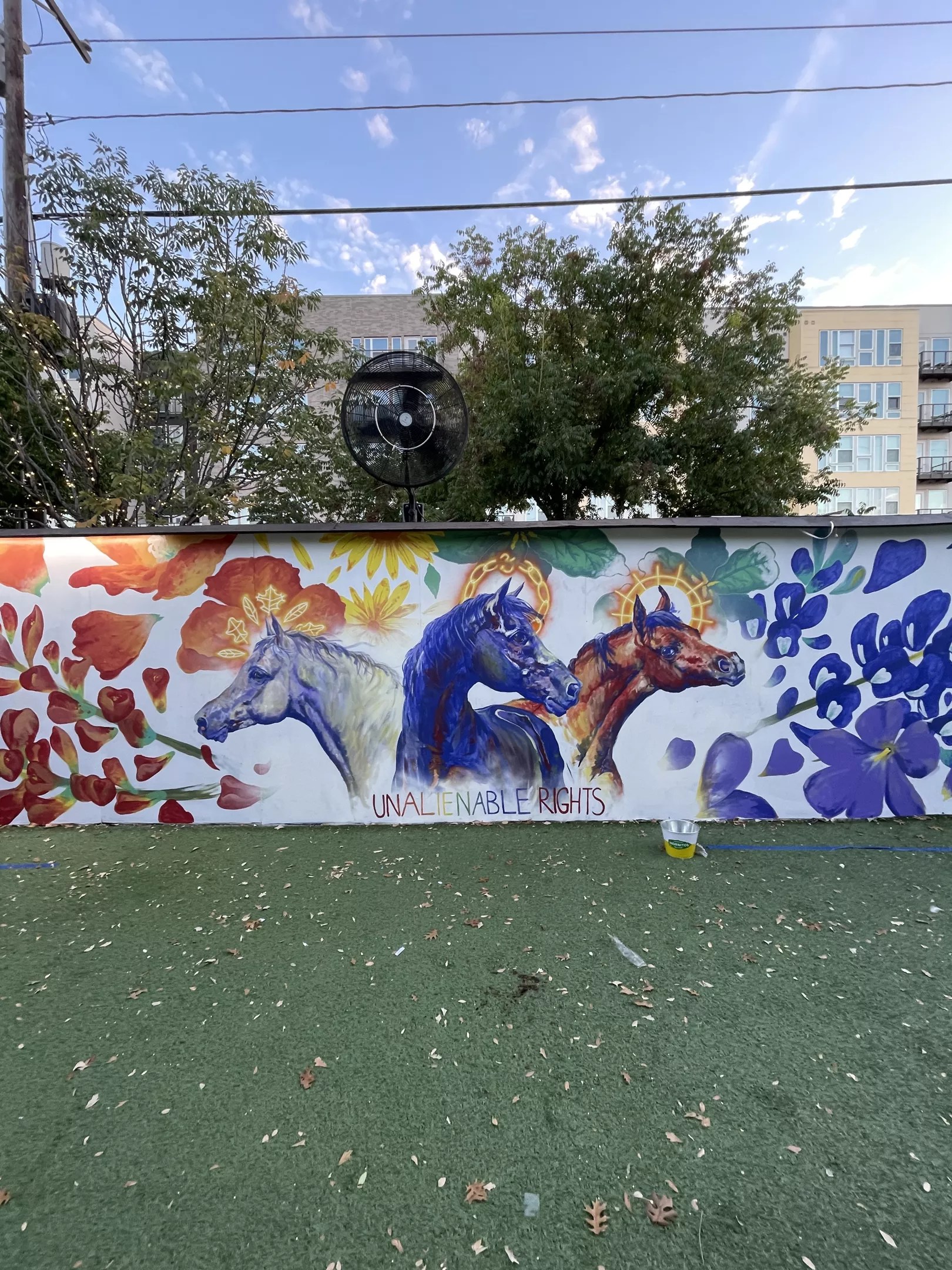 As Paek lives and works on a farm outside of Dallas, her painterly, impressionistic piece on an Art Park wall references what it means to be part of a small town and a big city simultaneously. The horses pictured represent “life, liberty, and the pursuit of happiness,” according to the artist.