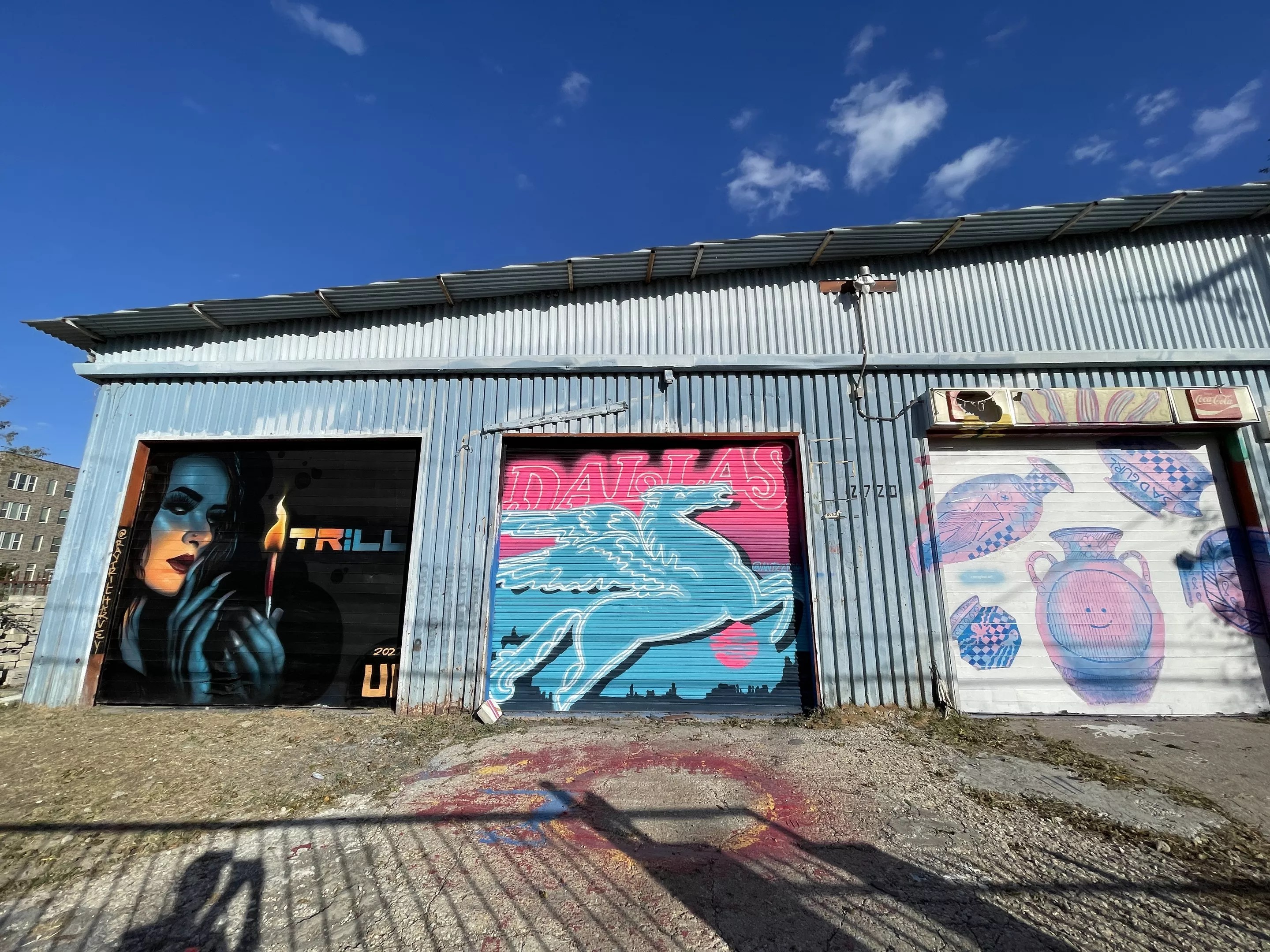 Newbie Wild West muralists Harvey, Chavez and Rigdon chose to adorn the doors on the old West Dallas Carpet building with imagery that expresses their aesthetics. In this case, a woman playing with flame, the iconic Dallas Pegasus and a Greek death pot vessel, respectively.